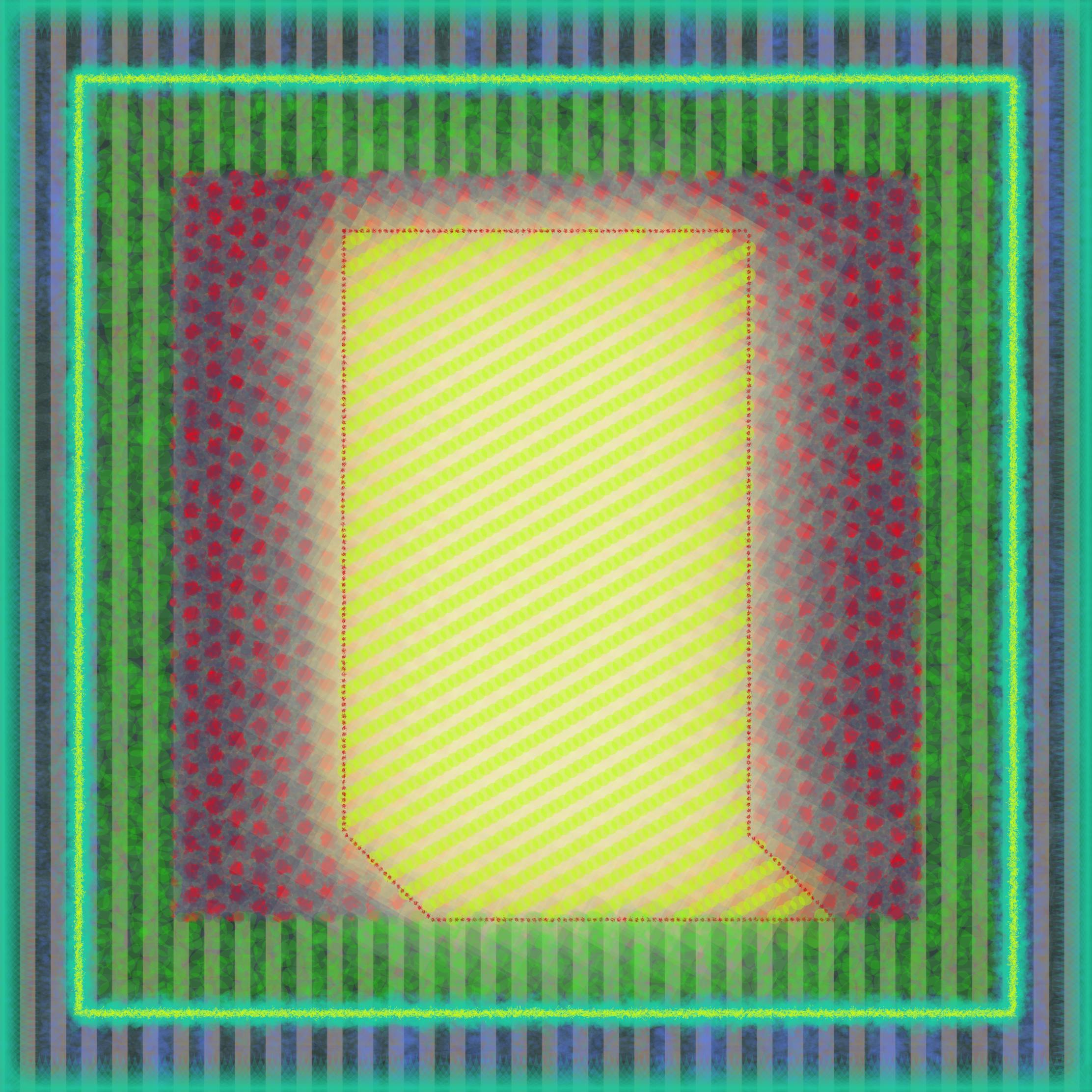 Created as an extension of investigating the door as a symbol in both the artist's life and broader culture. The artist creates his digital paintings using custom software. He selects and changes variables by hand, layering the output of the generative algorithms he's been writing since 2014. This process allows him to more rapidly and accurately manifest the vision in his mind's eye, compared to the physical materials he began his artistic career with over 20 years ago. After Yukio Ota's ISO Standard exit sign.
