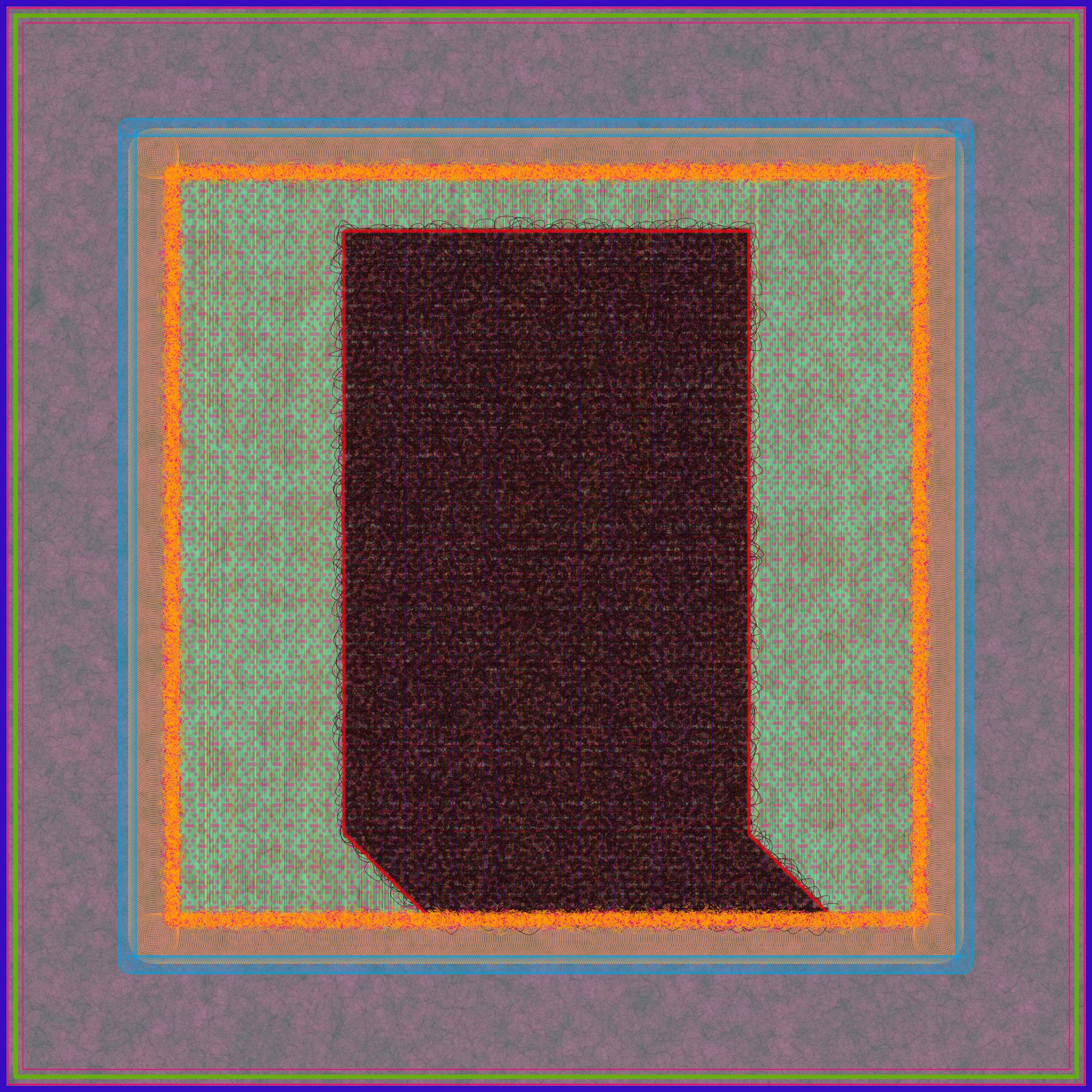 The artist creates his digital paintings using custom software. He selects and changes variables by hand, layering the output of the generative algorithms he's been writing since 2014. This process allows him to more rapidly and accurately manifest the vision in his mind's eye, compared to the physical materials he began his artistic career with over 20 years ago.