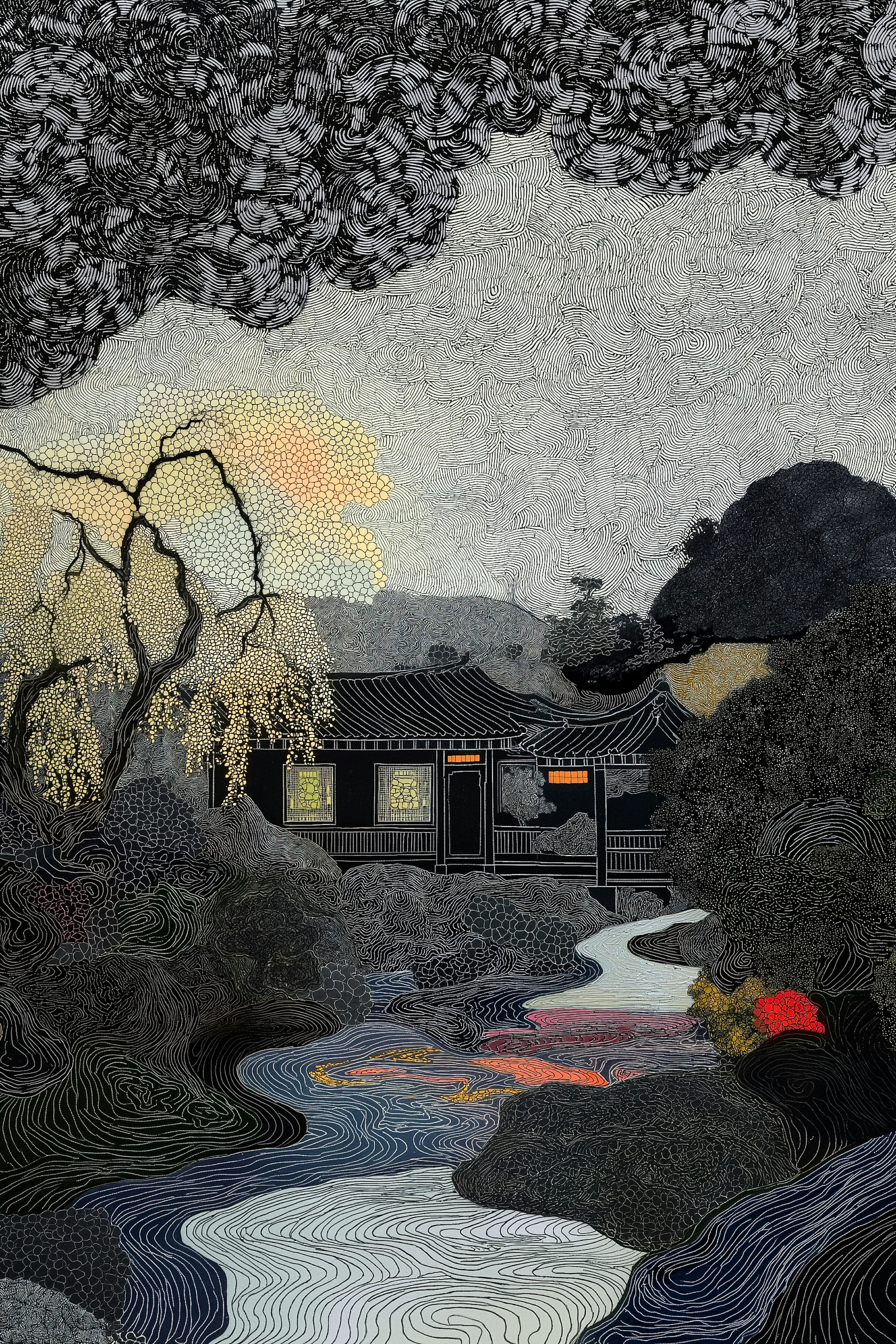 Each piece is composed using digital techniques and generative AI, which Nadler approaches as a creative collaborator rather than a directive force. This AI-assisted process enables a deep exploration of intricate details: microscopic pointillism, rhythmic linework, and layered textures. It turns facades into woven patterns, architecture into textile-like surfaces, and windows into harmonic sequences. Organic elements such as plants, stones, and sky merge seamlessly with built environments, resulting in a surreal fusion of order with wilderness, control with chaos.