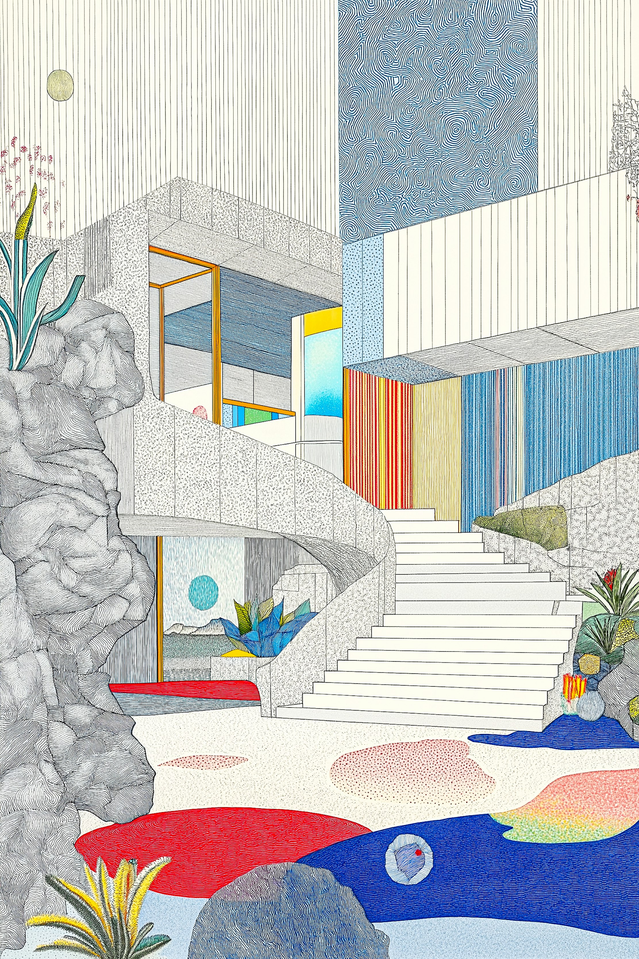 Each piece is composed using digital techniques and generative AI, which Nadler approaches as a creative collaborator rather than a directive force. This AI-assisted process enables a deep exploration of intricate details: microscopic pointillism, rhythmic linework, and layered textures. It turns facades into woven patterns, architecture into textile-like surfaces, and windows into harmonic sequences. Organic elements such as plants, stones, and sky merge seamlessly with built environments, resulting in a surreal fusion of order with wilderness, control with chaos.