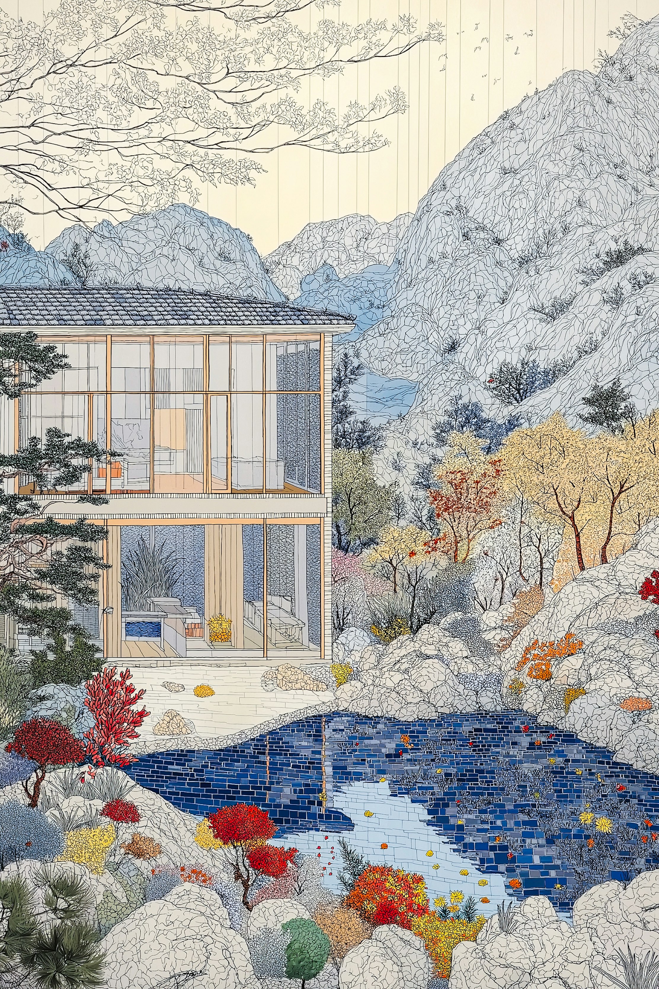 Each piece is composed using digital techniques and generative AI, which Nadler approaches as a creative collaborator rather than a directive force. This AI-assisted process enables a deep exploration of intricate details: microscopic pointillism, rhythmic linework, and layered textures. It turns facades into woven patterns, architecture into textile-like surfaces, and windows into harmonic sequences. Organic elements such as plants, stones, and sky merge seamlessly with built environments, resulting in a surreal fusion of order with wilderness, control with chaos.