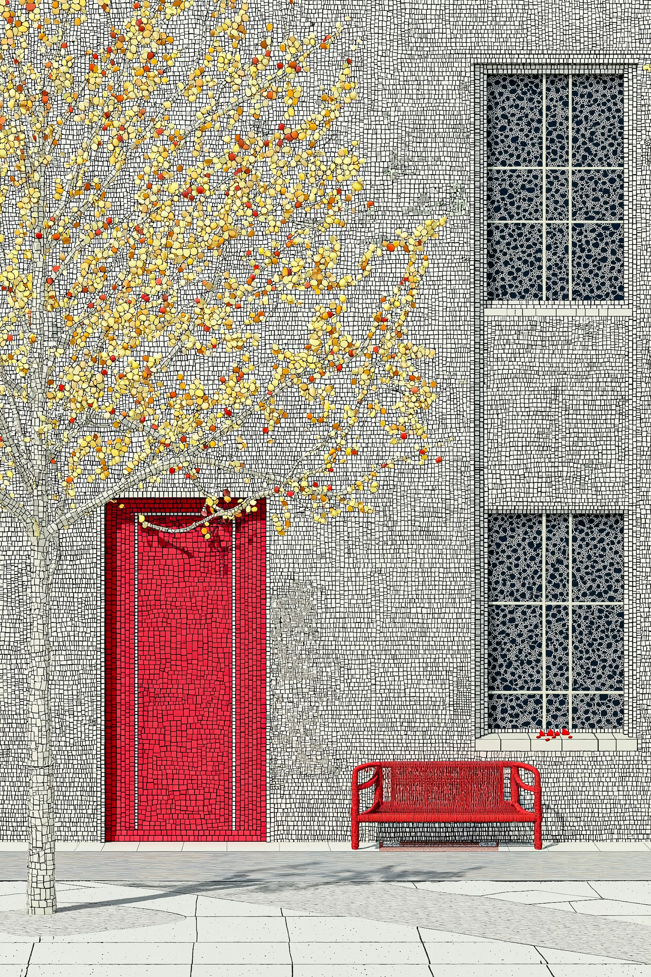 Each piece is composed using digital techniques and generative AI, which Nadler approaches as a creative collaborator rather than a directive force. This AI-assisted process enables a deep exploration of intricate details: microscopic pointillism, rhythmic linework, and layered textures. It turns facades into woven patterns, architecture into textile-like surfaces, and windows into harmonic sequences. Organic elements such as plants, stones, and sky merge seamlessly with built environments, resulting in a surreal fusion of order with wilderness, control with chaos.