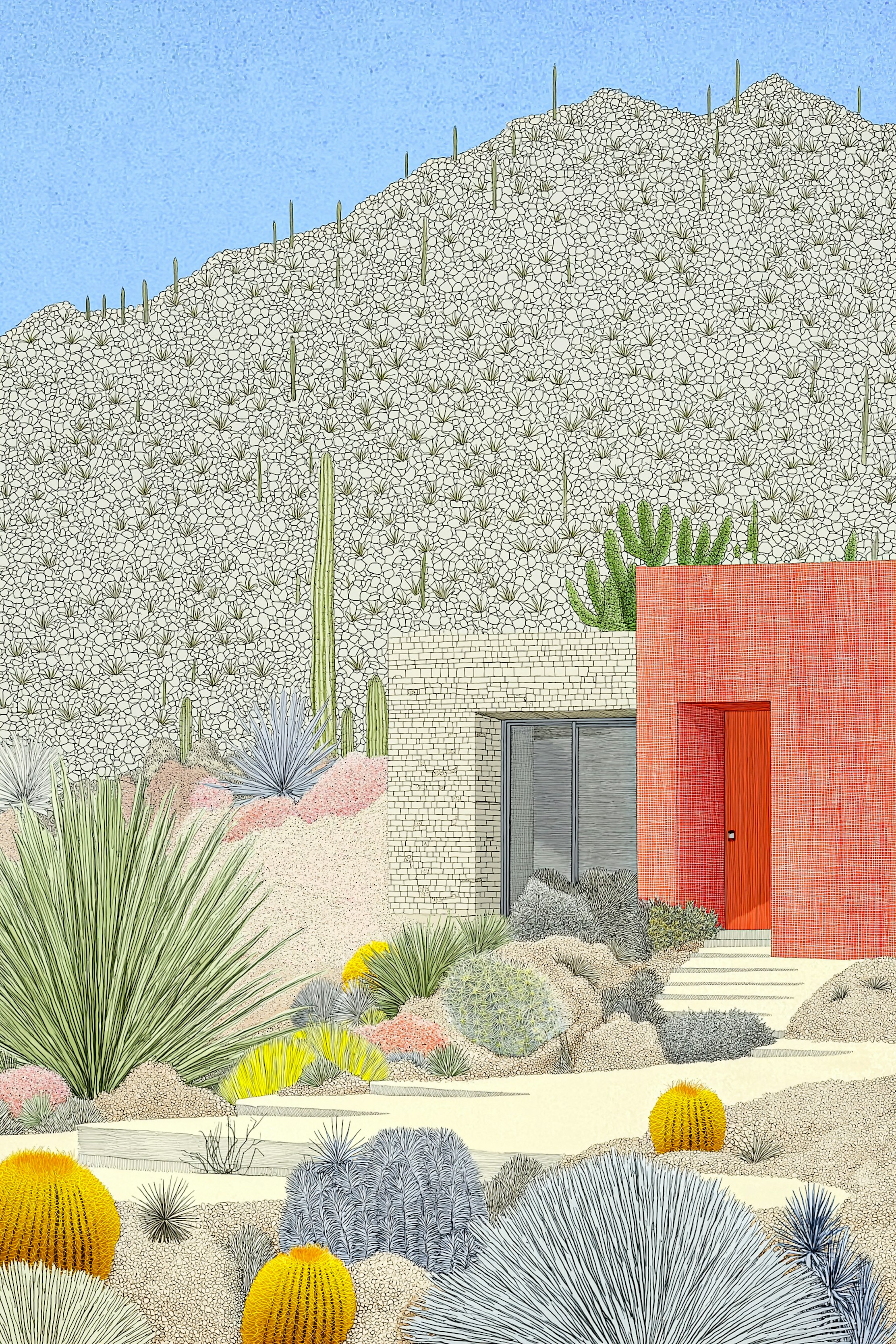 Each piece is composed using digital techniques and generative AI, which Nadler approaches as a creative collaborator rather than a directive force. This AI-assisted process enables a deep exploration of intricate details: microscopic pointillism, rhythmic linework, and layered textures. It turns facades into woven patterns, architecture into textile-like surfaces, and windows into harmonic sequences. Organic elements such as plants, stones, and sky merge seamlessly with built environments, resulting in a surreal fusion of order with wilderness, control with chaos.