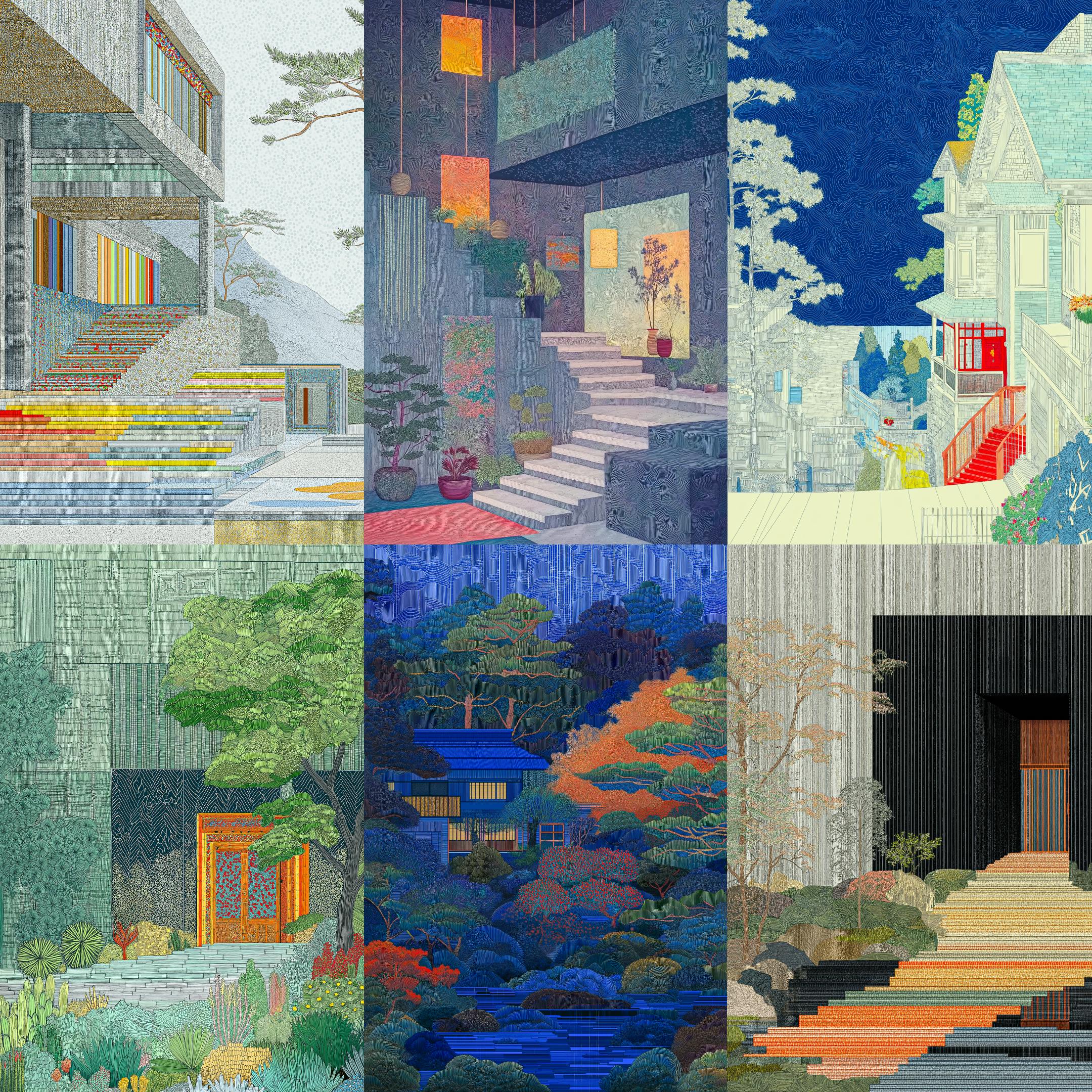 Each piece is composed using digital techniques and generative AI, which Nadler approaches as a creative collaborator rather than a directive force. This AI-assisted process enables a deep exploration of intricate details: microscopic pointillism, rhythmic linework, and layered textures. It turns facades into woven patterns, architecture into textile-like surfaces, and windows into harmonic sequences. Organic elements such as plants, stones, and sky merge seamlessly with built environments, resulting in a surreal fusion of order with wilderness, control with chaos.