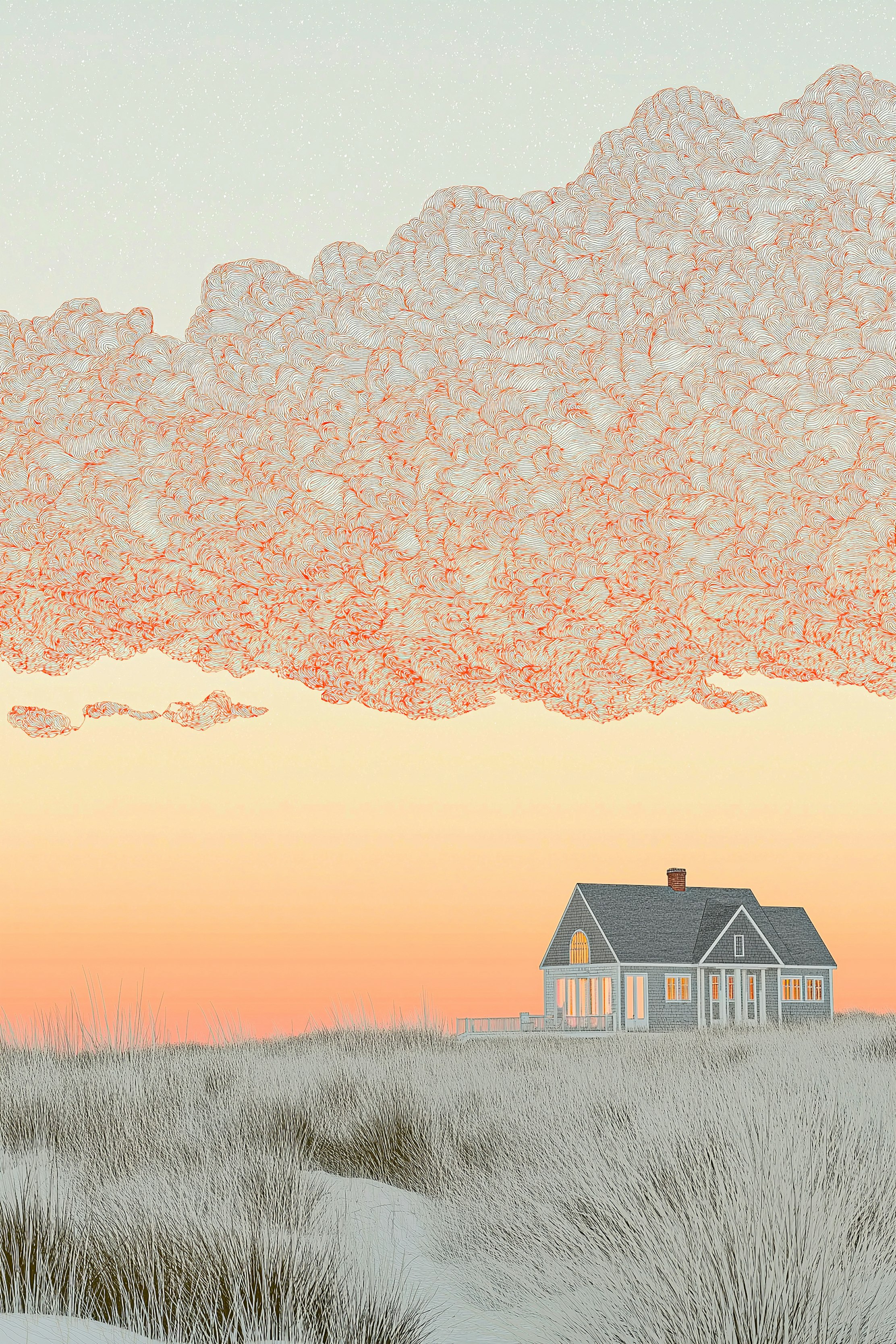 Each piece is composed using digital techniques and generative AI, which Nadler approaches as a creative collaborator rather than a directive force. This AI-assisted process enables a deep exploration of intricate details: microscopic pointillism, rhythmic linework, and layered textures. It turns facades into woven patterns, architecture into textile-like surfaces, and windows into harmonic sequences. Organic elements such as plants, stones, and sky merge seamlessly with built environments, resulting in a surreal fusion of order with wilderness, control with chaos.