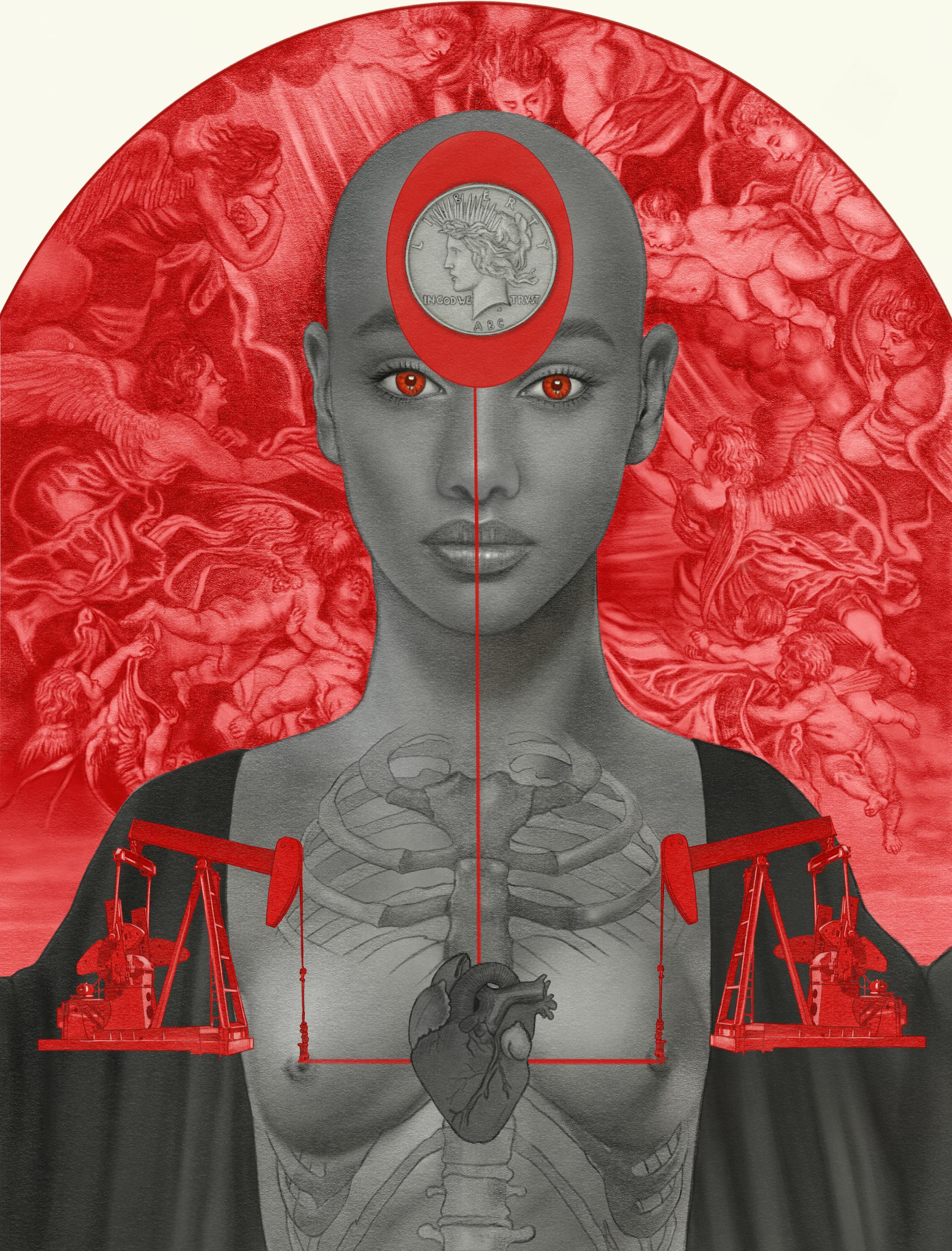 The work is represented by a woman in an almost religious environment who is fed by some fuel extracting machines with the intention of generating an ironic game between religion, ideology and science.