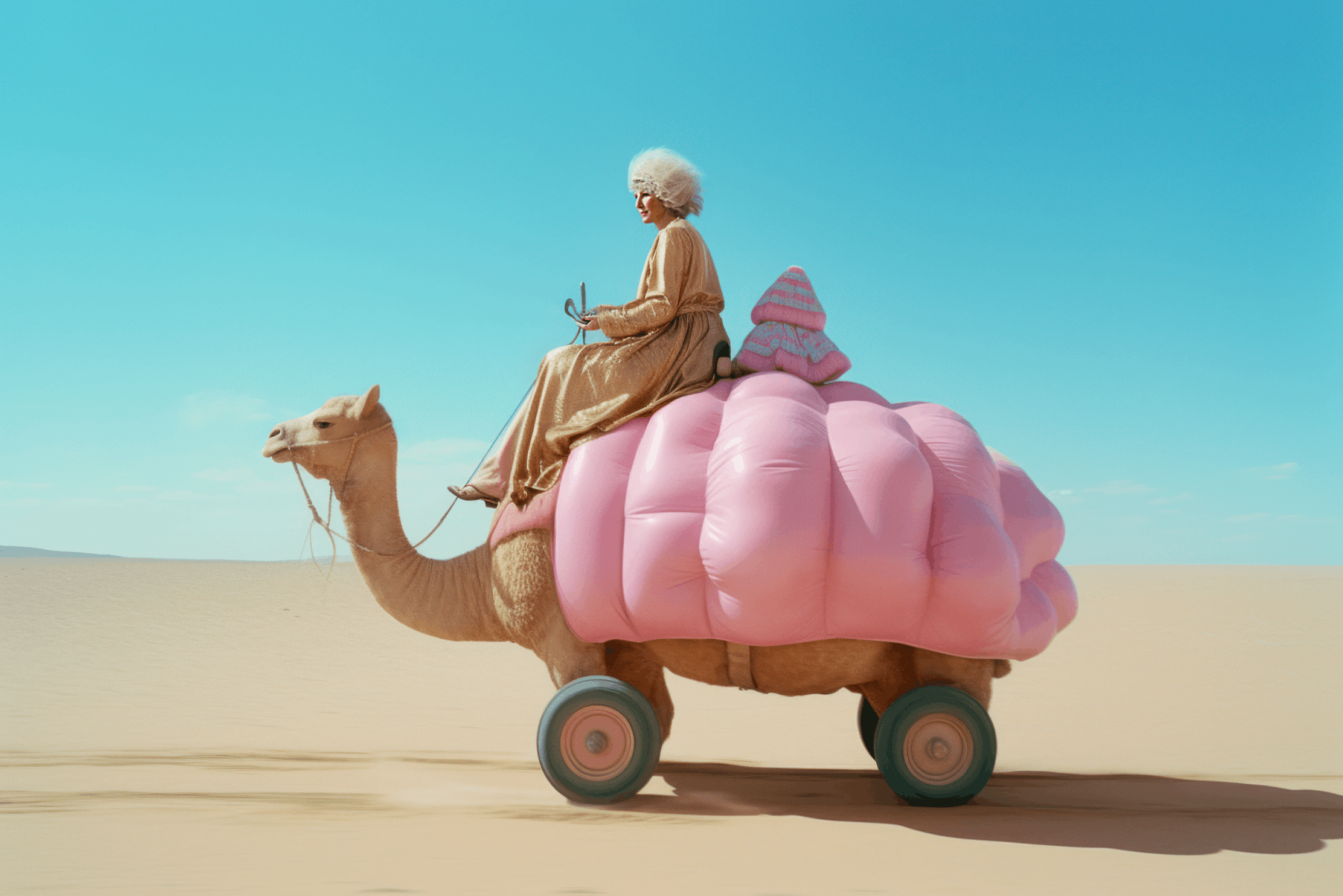 “Onwards” portrays a woman fearlessly mounted atop a semi-mechanical camel, the fusion of nature and technology, as an unstoppable force driving through a vast desert. The piece encapsulates the thrill of surpassing perceived boundaries, inspiring us to embrace our own perhaps unconventional paths.