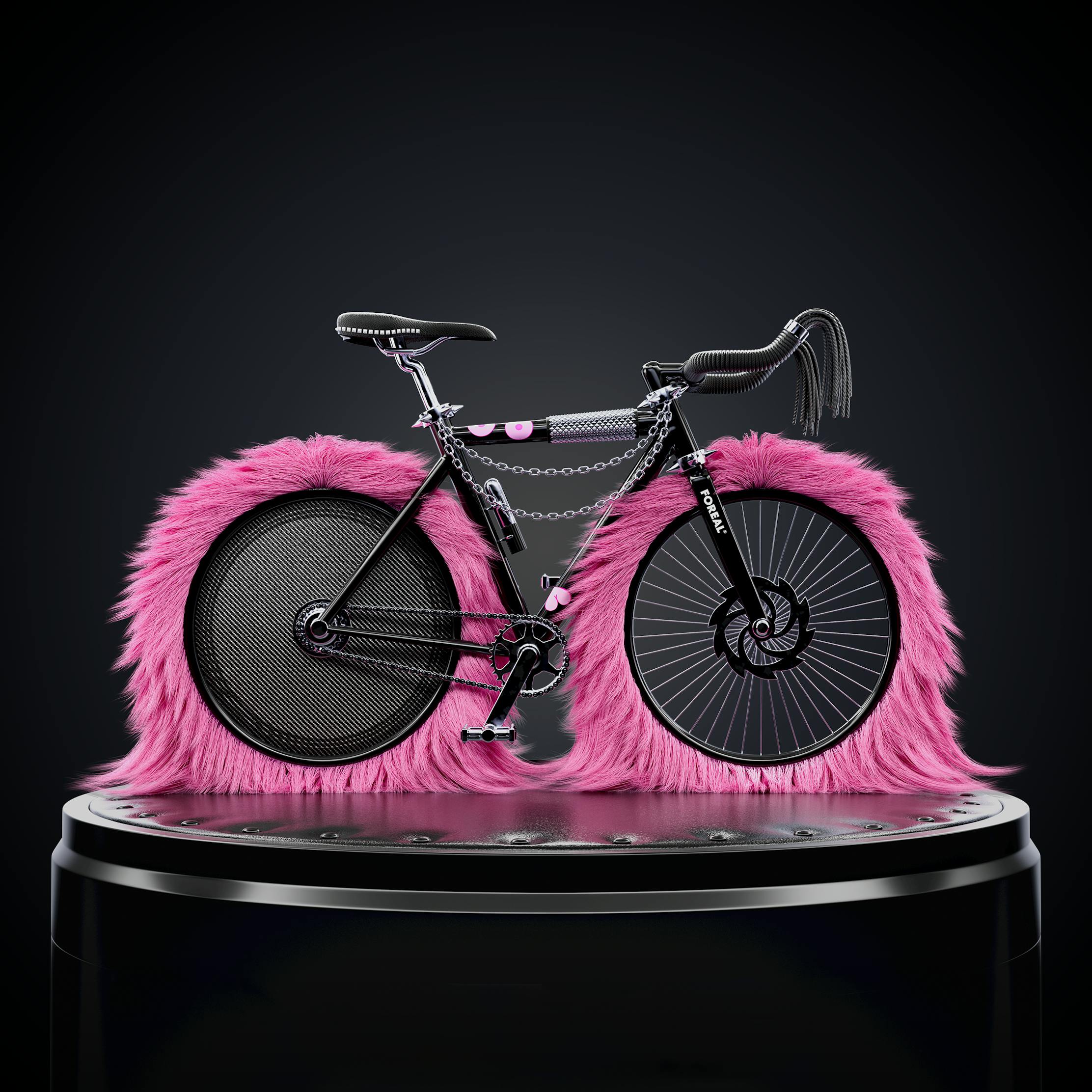Highly polished chrome, tight leather and a super fluffy pink wheel . This bike promise you a complete novel cycling experience, if you dare to let yourself go and relax.