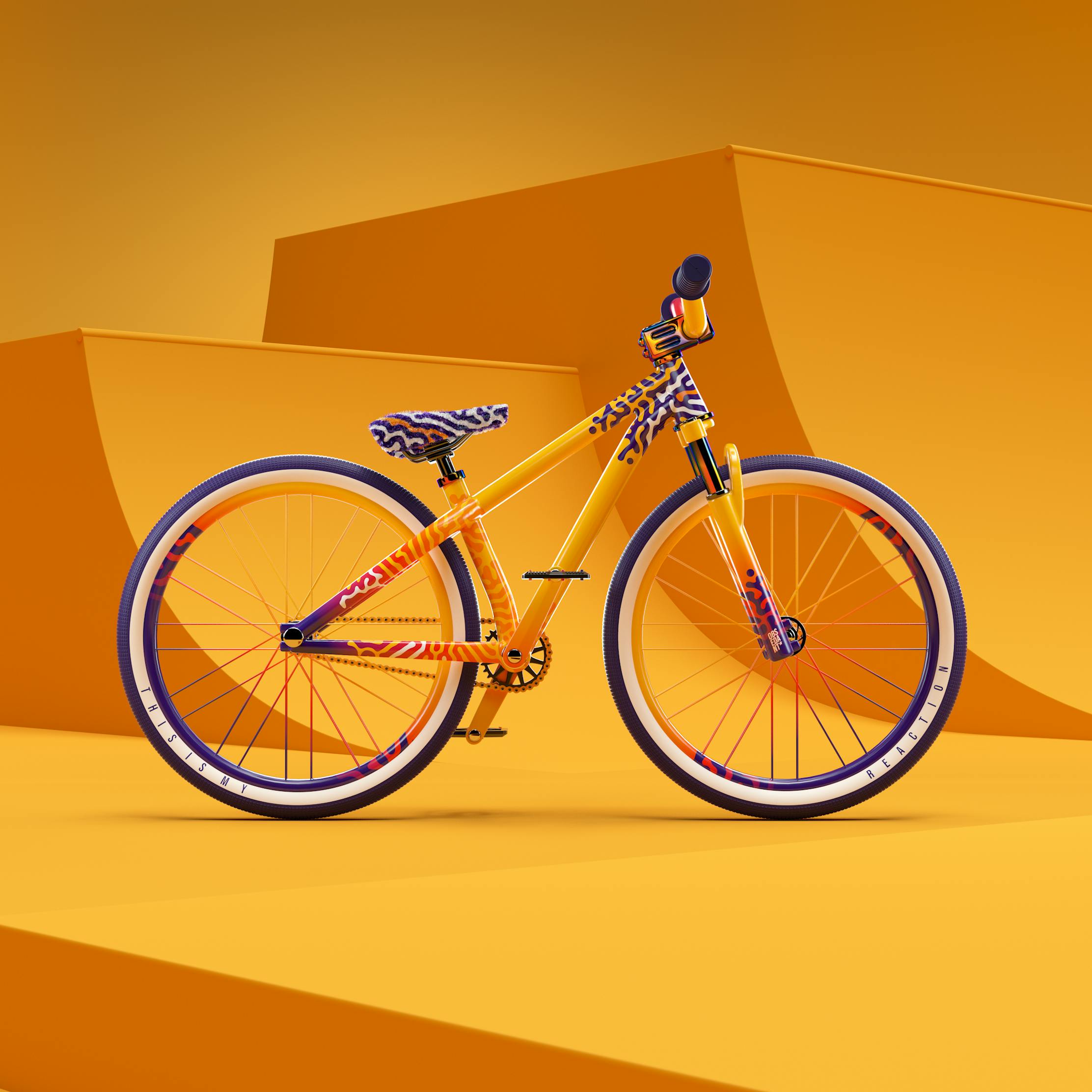When Cycl:R asked me to create a bike from a blank template, my immediate "reaction" was quite nostalgic. I spent a decent amount of years in skateparks and dirt parks riding a dirt jump mtb, so the bike choice was obvious for me. Completely remodeled, custom painted in a reaction-diffusion pattern, and proudly standing in its yellow natural habitat, representing our segment of bike culture... This is my reaction.