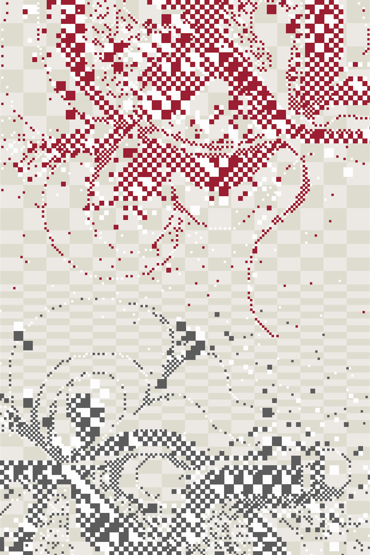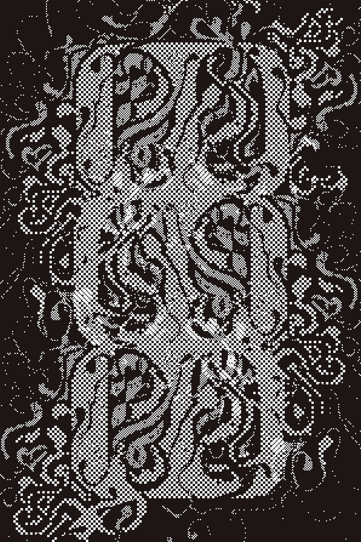 Inspired by illuminated manuscripts of the Middle Ages, Covenant presents a novel approach to handcrafted pixel art. This series invents intimate new letterforms by intertwining two uppercase letters. Created using a custom drawing tool specially programmed by the artist, these works appear ornate from a distance while carefully revealing their low-fidelity, checkerboard construction upon closer inspection.