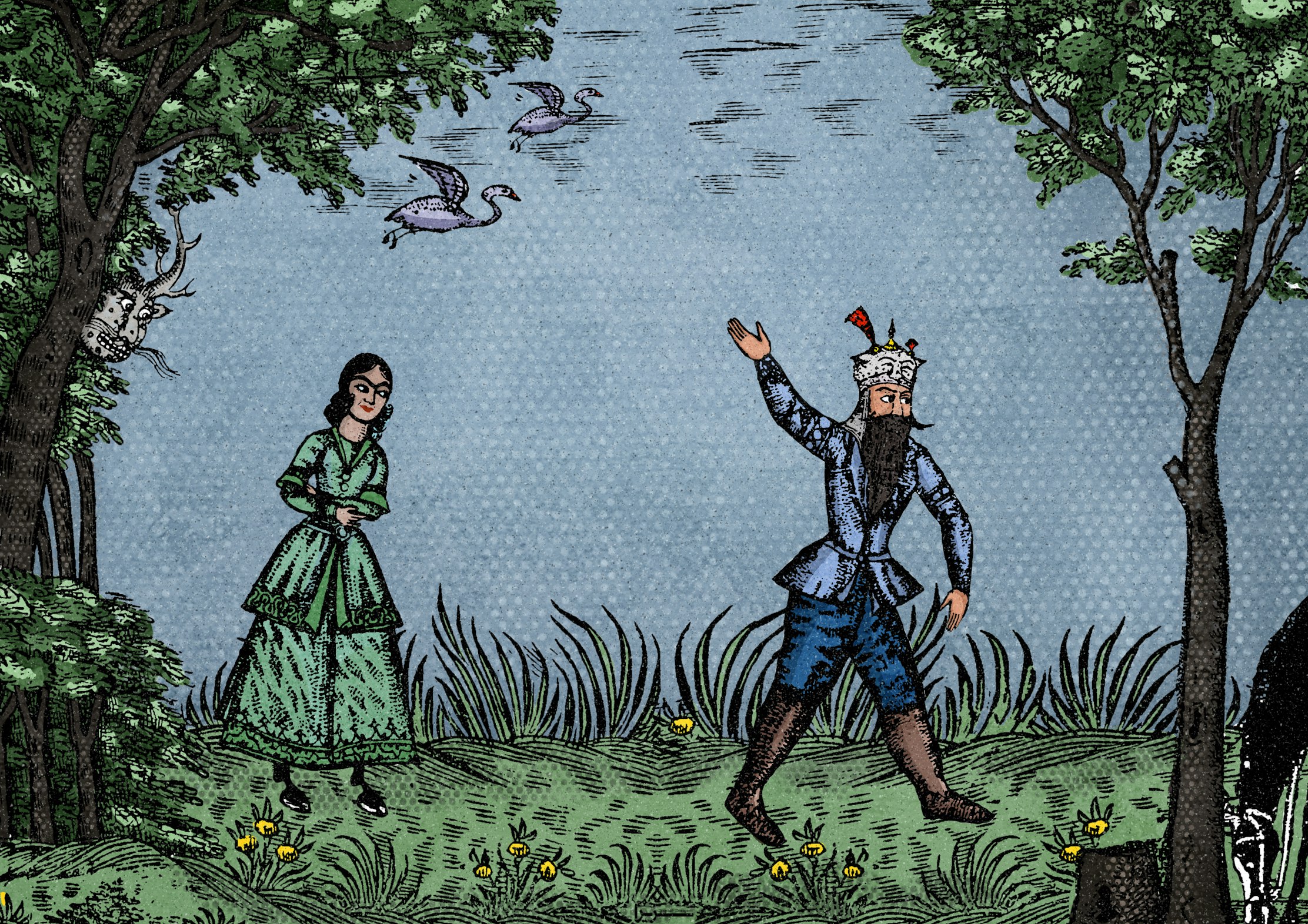 After conquering the lion, crossing the barren wastes, and slaying the dragon, Rostam enters a meadow so lush it seems a reward for his perseverance. Yet this paradise conceals a sly enchantress. Cloaked in beauty, she sets a banquet on a crimson cloth—goblets of wine gleaming like jewels, platters of ripe fruit bursting with color. Hidden among rose bushes, she steps forth, her raven hair and twilight-hued eyes captivating the weary hero.