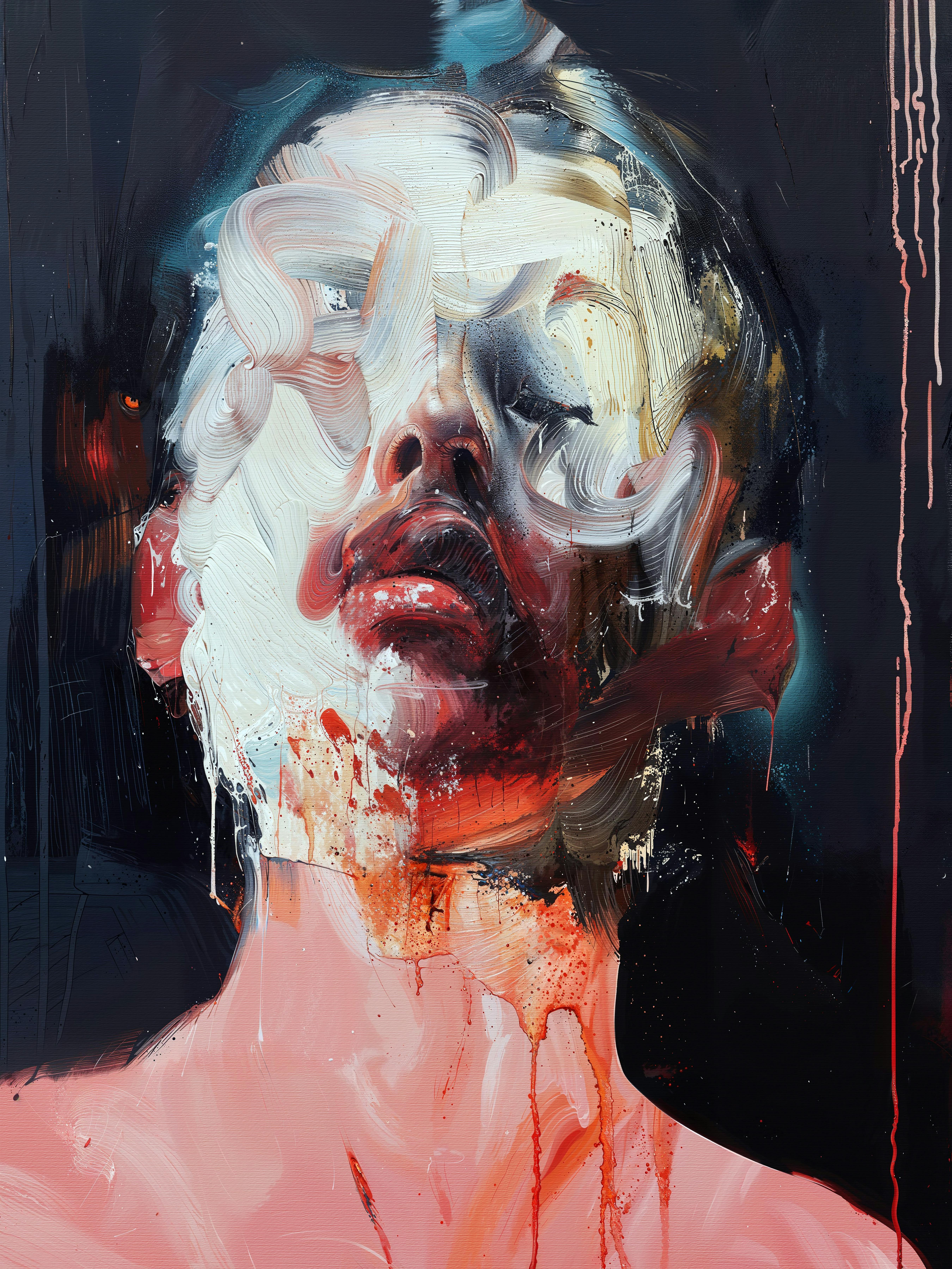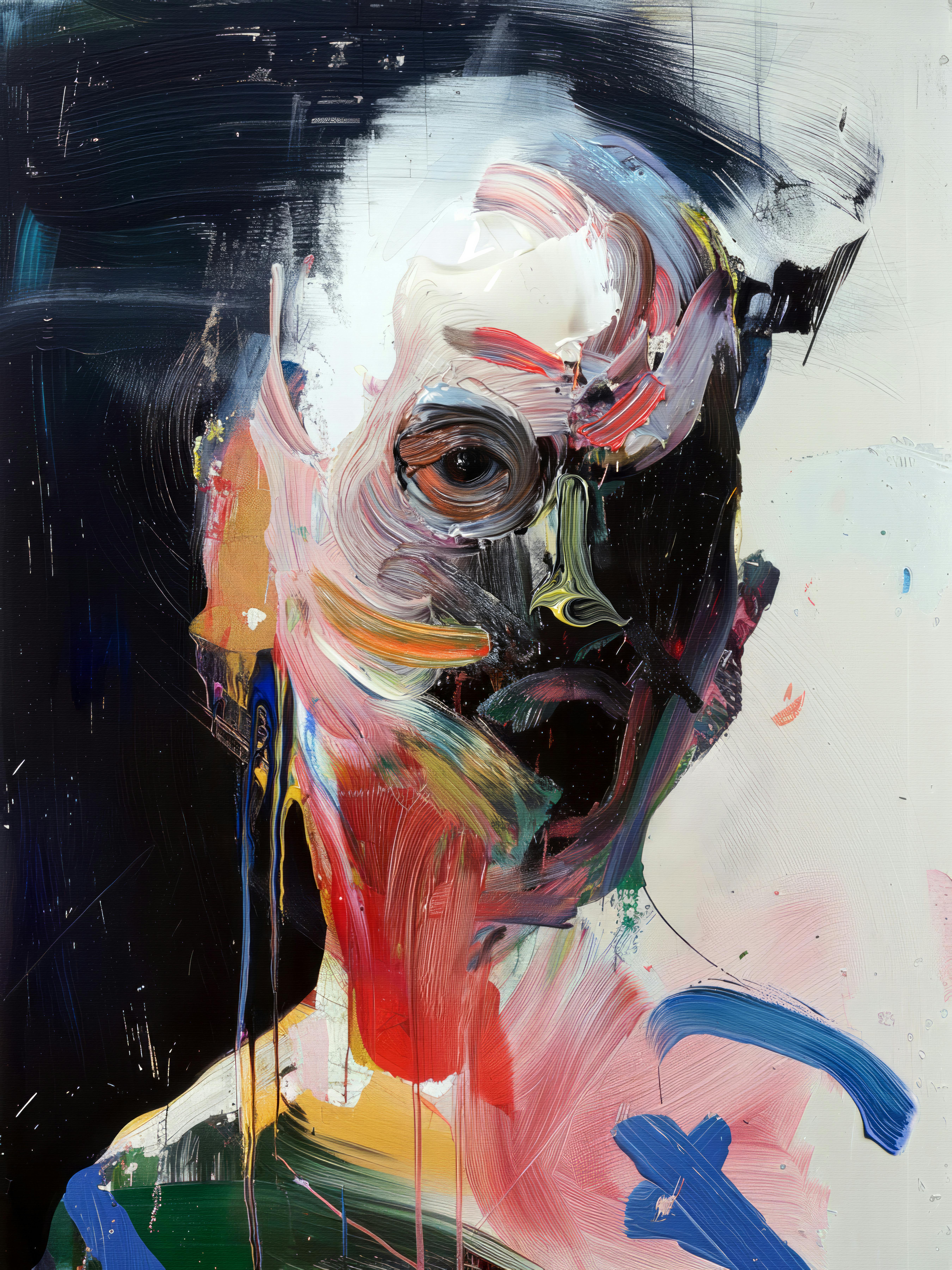 This series of abstract portraits explore different facets of the human condition such as joy, suffering, and identity. These works move away from realistic depictions, instead using fragmented and distorted forms to represent the human figure. This abstraction allows the pieces to dynamically represent the interplay of internal and external forces that shape human experiences and perceptions. The use of varied textures in the artwork adds a tactile depth that enhances the thematic expression of each portrait. These textures range from rough, illustrating psychological turmoil, to smooth, suggesting serenity and introspection. By employing abstract forms and deliberate textural contrasts, the series encourages a deeply personal interpretation, prompting viewers to reflect on the complexities of human emotions and their own place within the broader human experience. Mixed media: AI + Digital Painting by @dehiscenceart, July 2024