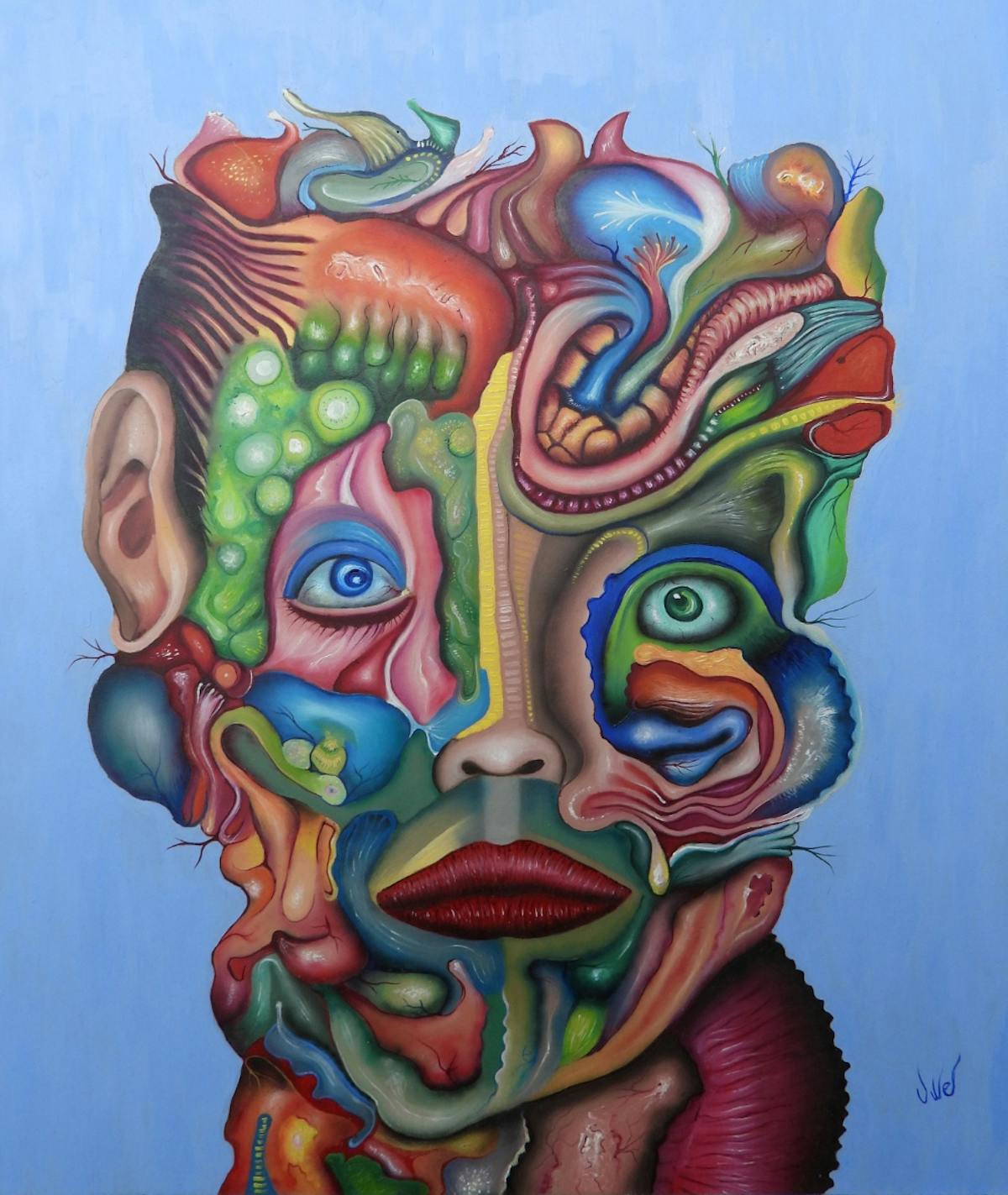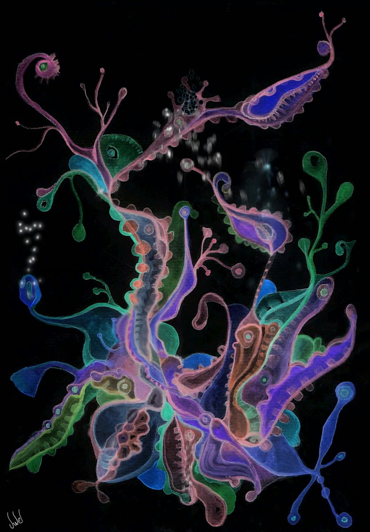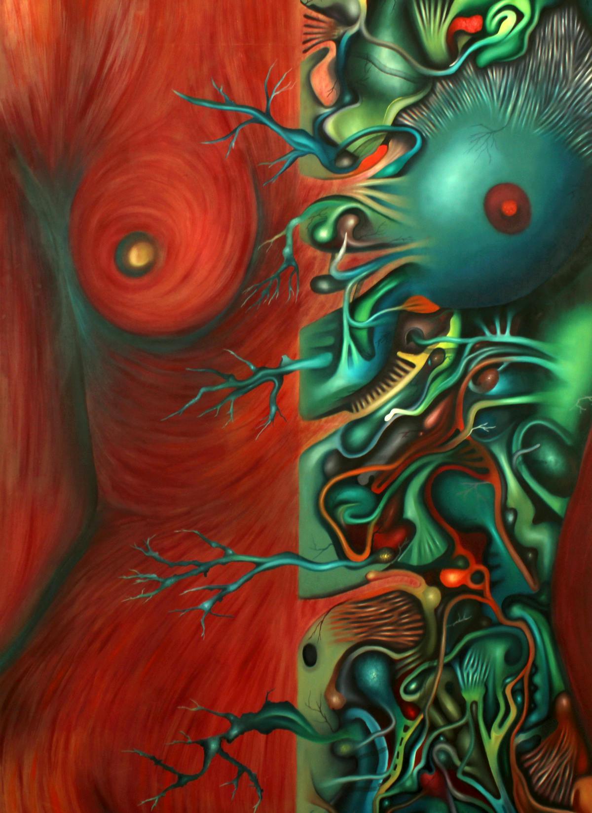 I used artificial intelligence based on my pictorial work to generate an animation and a story. I took the visual elements—the shapes, the colors, the textures—and fed them into the model as creative seeds. The AI transformed those fragments of my work, giving them a life of their own: figures that were once frozen on the canvas began to breathe, to move, to interact. From there, a visual narrative was born, a kind of digital mythology built upon my own symbols, exploring the same themes as the painting.