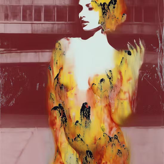 Bathed in spectral blue, the figure appears both ethereal and defiant, her shadow anchoring her against the brutalist wall behind. The paint bleeds into the body like divine interference, blurring the line between sanctity and flesh. This is not innocence, but intention — a portrait where angelic grace becomes an act of will, sharpened by fracture and emergence.