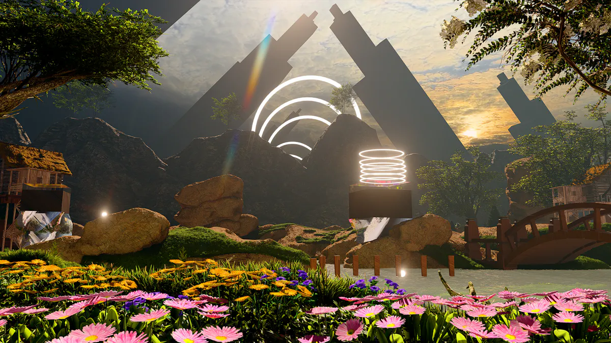 A surreal visual imagined by me inspired by the phenomenon of the sun shining even as it rains, in my mind the rain comes from a waterfall above the clouds produced by the finest rocks, leading to little drops of rain, this a recreation of a 2D artwork done by me from 2021 in 3D.