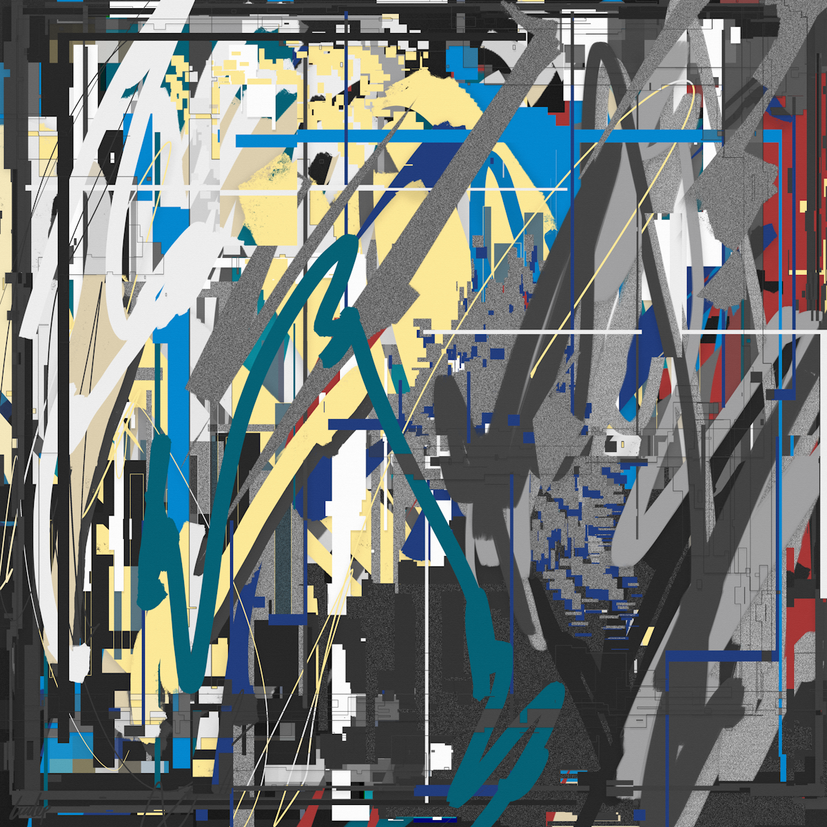 An artwork inspired by the competitive struggle to rise above the dark cloud of the algorithm. Vibrant energy and mixed personalities contending to be seen but, colliding and fragmenting creating a collaborative existence