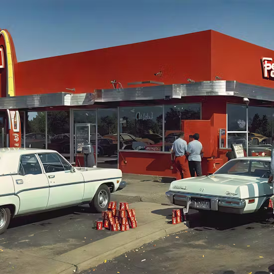 Created in 2022, Rainisto employs the visual style of vintage Americana photography and the capabilities of early custom finetuned diffusion models. Each piece captures the post-war United States atmosphere, examining mass production, overconsumption, excess and food uniformity. It draws parallels between the mass production of fast food and AI’s emphasis on efficiency and scalability, suggesting a trend towards cultural and creative homogenization.