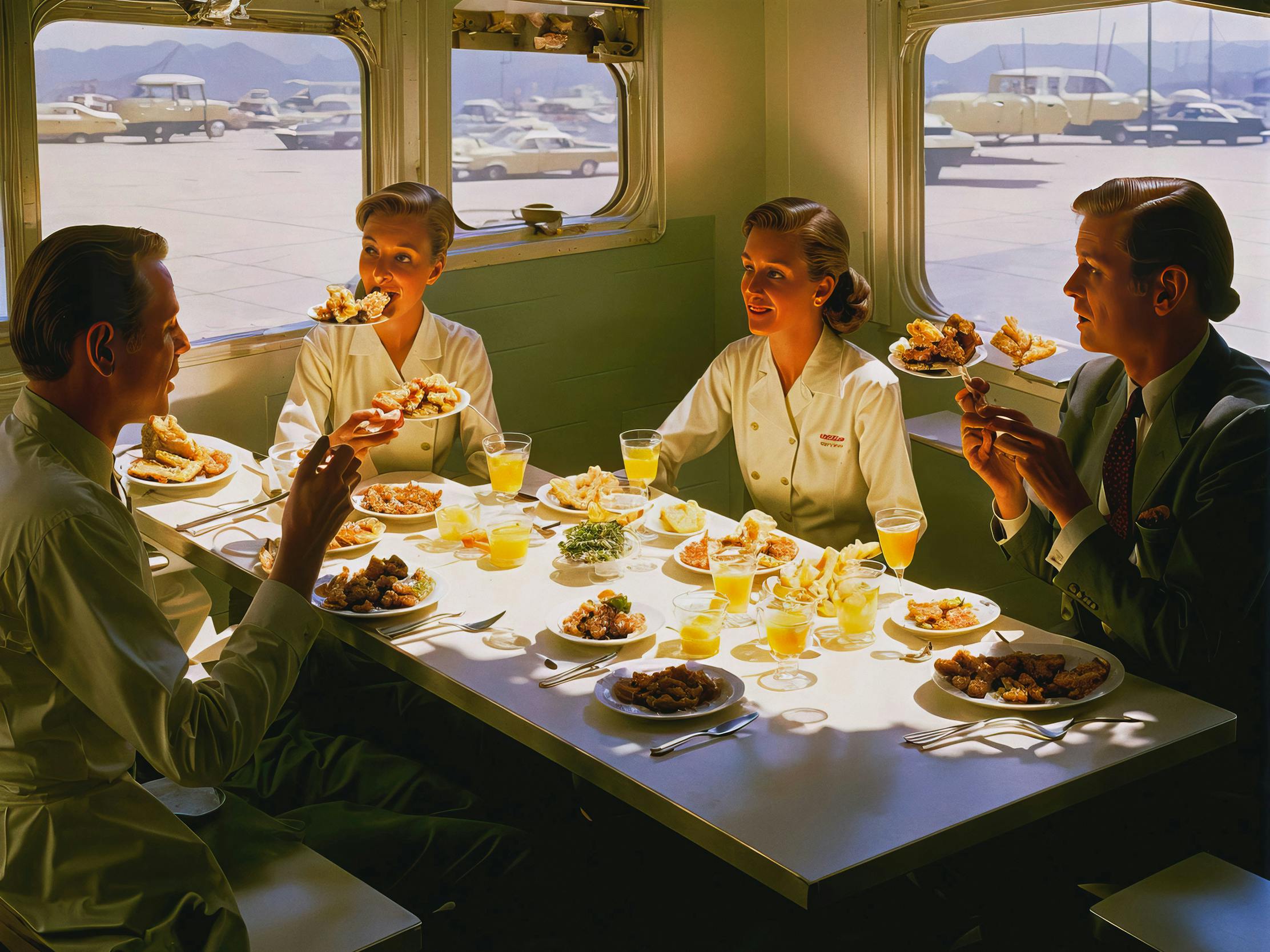 Created in 2022, Rainisto employs the visual style of vintage Americana photography and the capabilities of early custom finetuned diffusion models. Each piece captures the post-war United States atmosphere, examining mass production, overconsumption, excess and food uniformity. It draws parallels between the mass production of fast food and AI’s emphasis on efficiency and scalability, suggesting a trend towards cultural and creative homogenization.