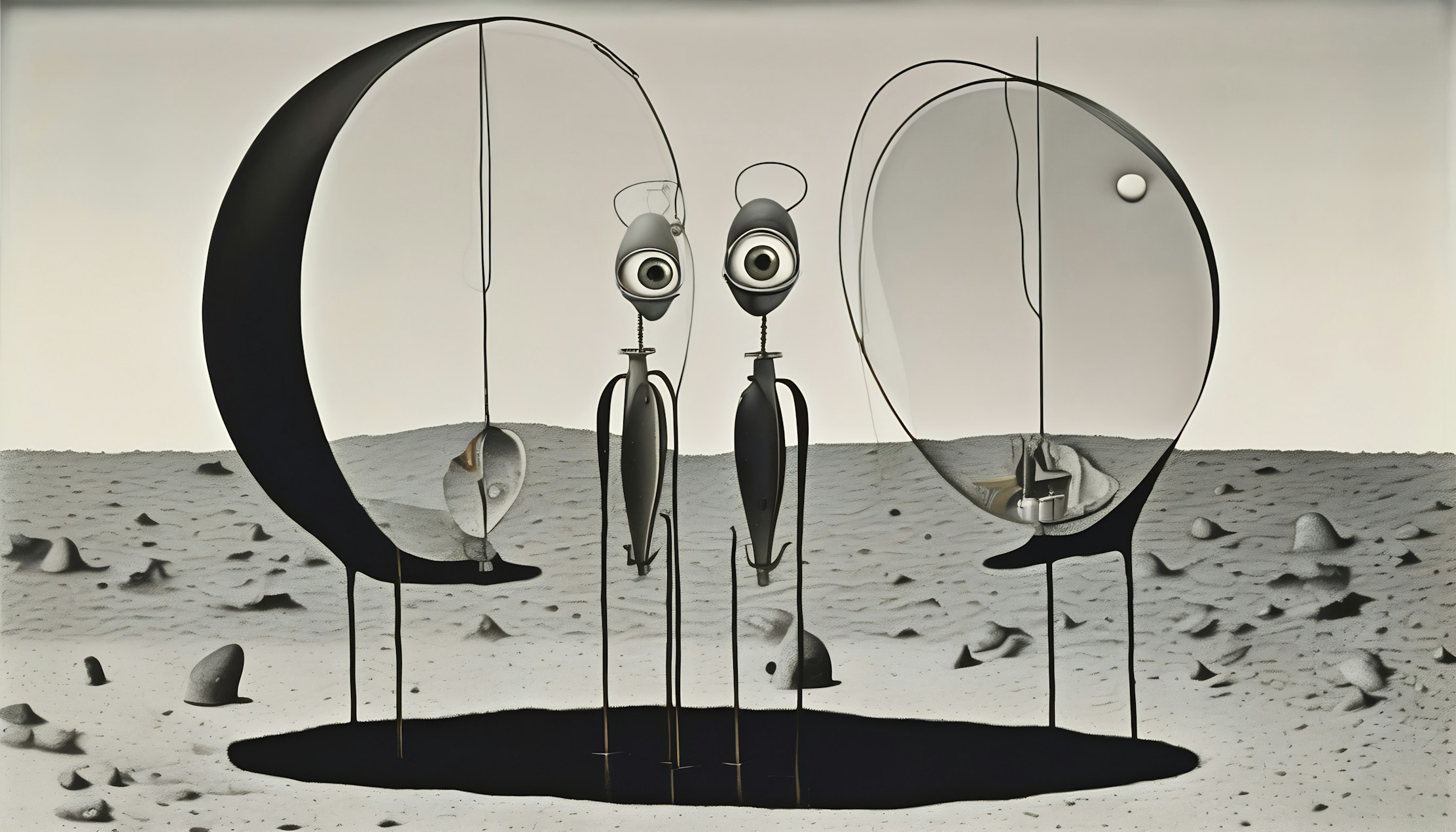 Two of them faced each other, poised in silent conversation. Observers, listeners, perhaps guardians of a truth we could only guess at. Was it the secret mechanics of sight they guarded, or the intangible threads that bind observer to observed? Beneath their gaze, the soil bore a pitch-black emptiness—a void where not even light could escape. This absence of color was a stark canvas, etching out everything that stood above it.