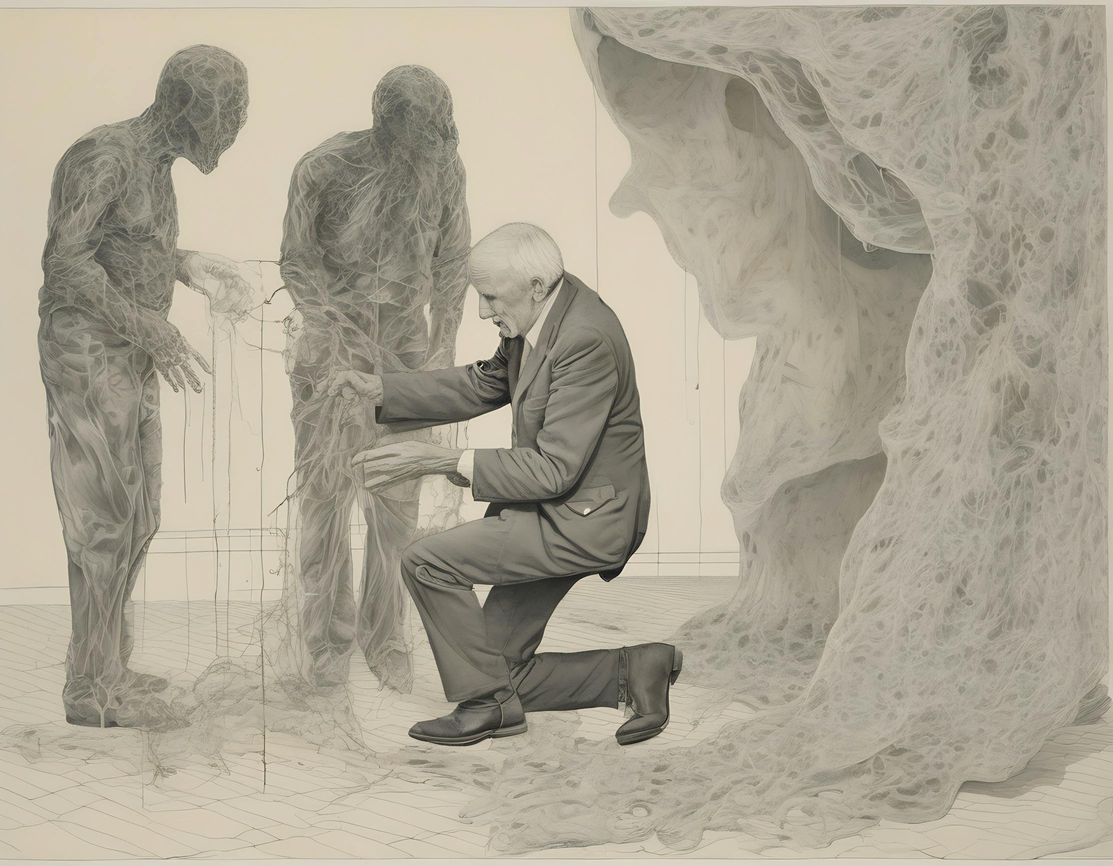 The figures around him, translucent and silent, loomed like sentinels of a forgotten age, their inscrutable gazes fixed on the marionette of strings. They were echoes of human form, manifestations of the thought that matter, once conscious, leaves an indelible imprint in space-time—a shadow never fully erased.