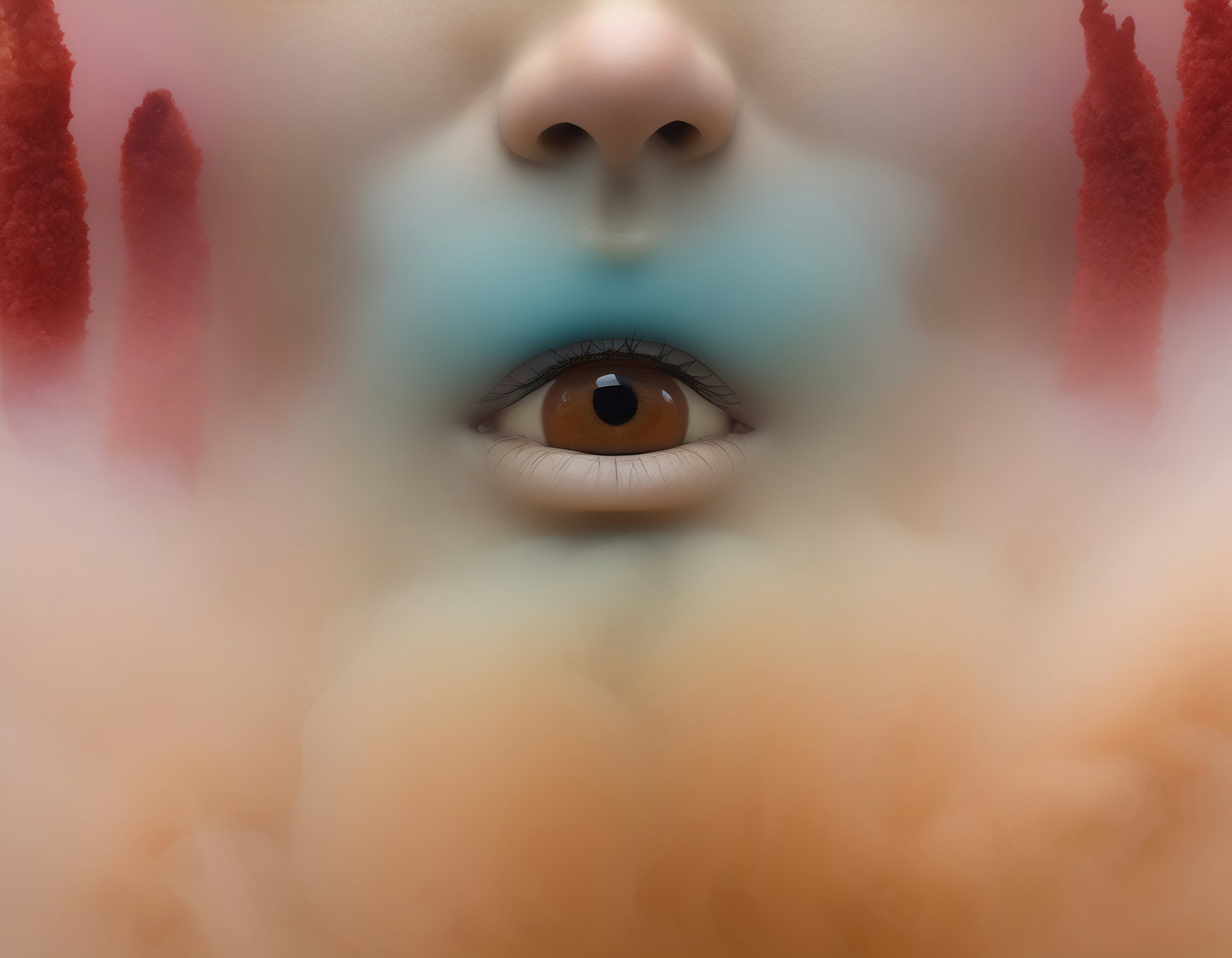 2024 July #003. Soft whispers of being, through veils of the unseen, echo lightly, caress the edges of a dream. Wisps of thought, afloat on air, touched by hues, of crimson fears, and blues of infinite views. Eyes wide with the weight of silent stories untold, capturing moments, precious more than gold.