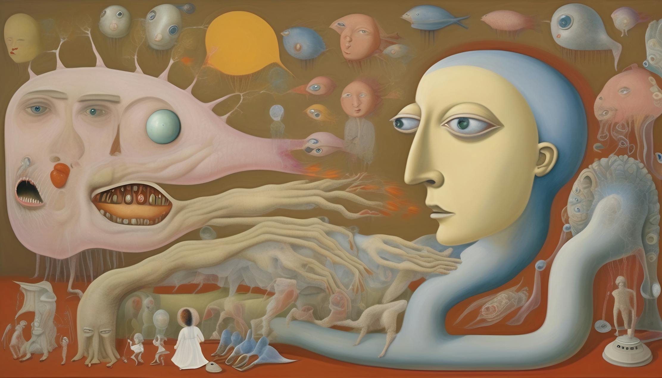 Consider the paradox of the eye wide open, unseeing yet overtly fixed on something beyond the frame, a silent conductor to this visual symphony. It raises questions of perception and the nature of reality, of what it is to truly see. Every hue is deliberate, mocking the randomness we are so often surrounded by, challenging observers to find meaning behind the gradients of experience.