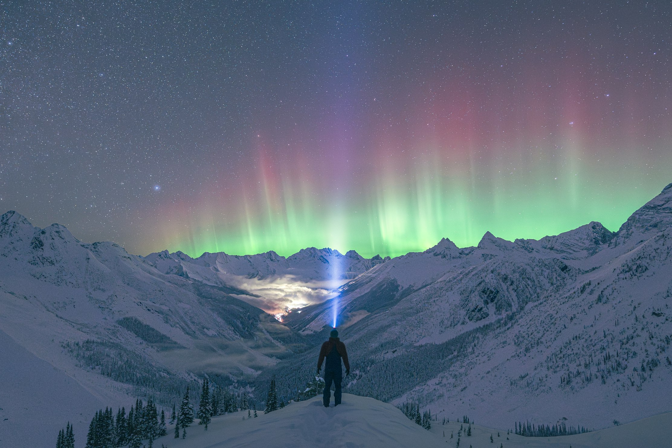 Before I went to bed the conditions totally changed. The sky cleared, revealing moonlit peaks and a crisp, star-filled mountain air—the exact opposite of the forecast, which had called for two days of cloud and snow. I had seen a small chance of aurora in the forecast, but didn’t think much of it. Nodding off reading my book, I told myself I’d step outside for a quick bathroom break before bed. If I didn't see anything, I'd go to bed, if I did, I'd stay up and take a few photos.