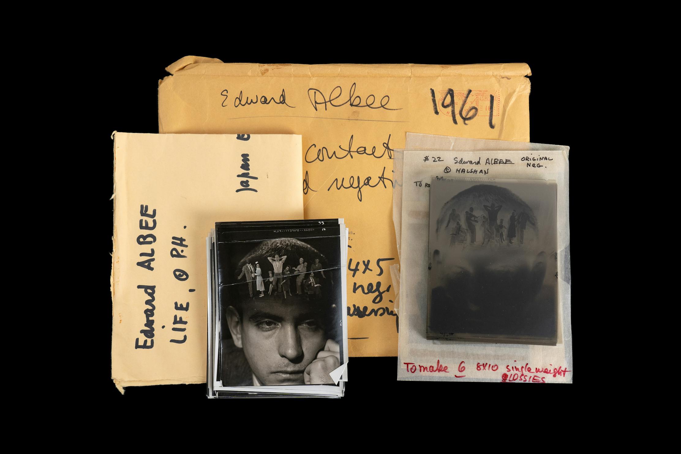 The playwright Edward Albee was born in 1928 and adopted by a vaudeville magnate and socialite. He grew up outside of New York City and at age 18 moved to Greenwich village. He is considered one of the masters of American theatre. His first play was performed in 1959 in Berlin, and 2 years later Halsman was commissioned to photograph him for LIFE. Halsman saw Albee’s plays "The Death of Bessie Smith" and "The American Dream" and came up with an idea for the shoot -to show all of the actors and actresses in the imagination of the author. Halsman photographed the group of actors on one negative, and Albee on another negative. Halsman intentionally did not light Albee’s forehead, which left an empty space on the negative. When the two negatives were placed on top of one another in the darkroom, the actors appear in the blank spot on Albee's forehead. The "sandwiching" of negatives was the analogue darkroom hack to make two images appear to be one. The following year, Albee’s groundbreaking play "Who’s Afraid of Virginia Woolf" premiered, and won a Pulitzer Prize, and his first Tony Award.