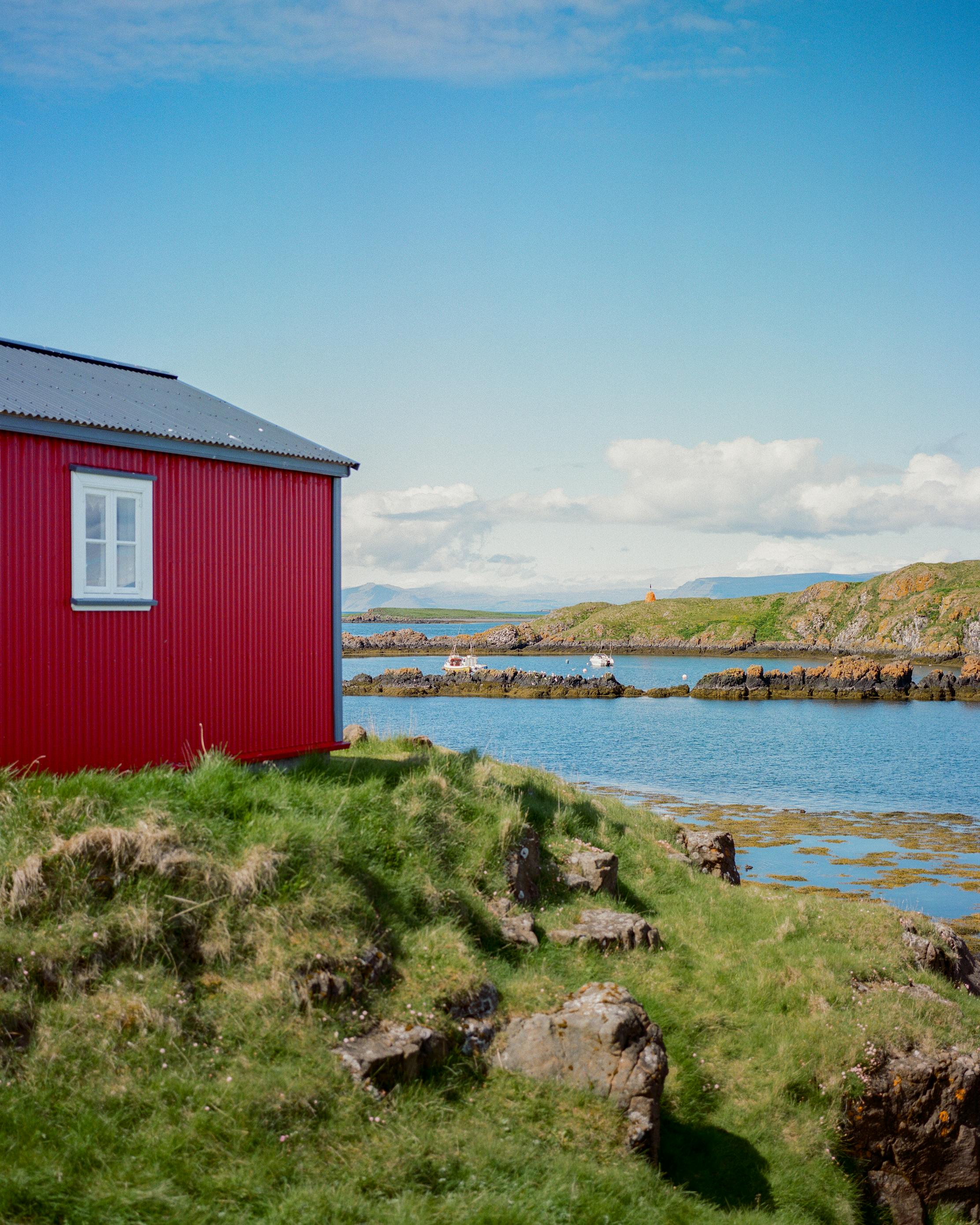 An idyllic day on Flatey unfolds with golden sunlight glinting off the calm waters of Breiðafjörður, as we walk past colorful, historic cottages, watch puffins nest along the rugged cliffs, and enjoy a peaceful moment with a warm cup of coffee overlooking the harbor.