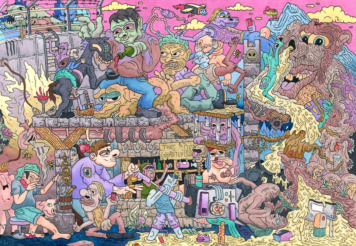 An orgy of flesh, machines, vices, and mutations, where every character is a grotesque exaggeration of human habits.