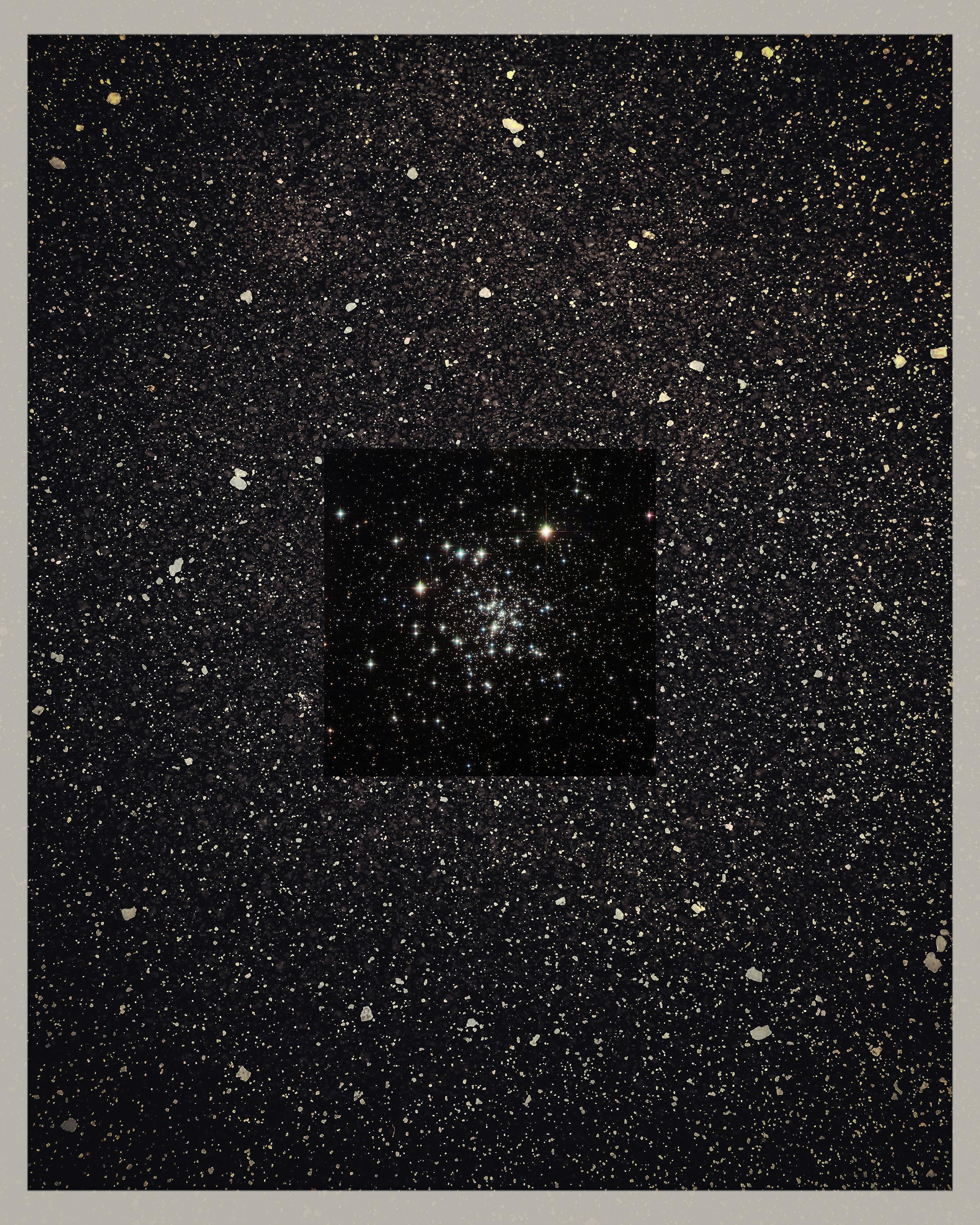 A photomontage of a Nasa photograph of NGC 6535, a globular cluster 22,000 light-years away in the constellation of Serpens (The Serpent) that measures one light-year across composited with a photo I took of a parking space covered in rock salt located at the Barnes & Noble Starbucks 7.8 miles away that measures less than one car width. The Nasa photo is part of "Nasa on the Commons" a database of more than 2,000 historical images available on the "NASA on the Commons" page of the flickr website. The Starbucks is open to the public from 9am-8pm but is currently taking mobile orders only due to COVID19. Neither NASA nor Starbucks endorses this photomontage.