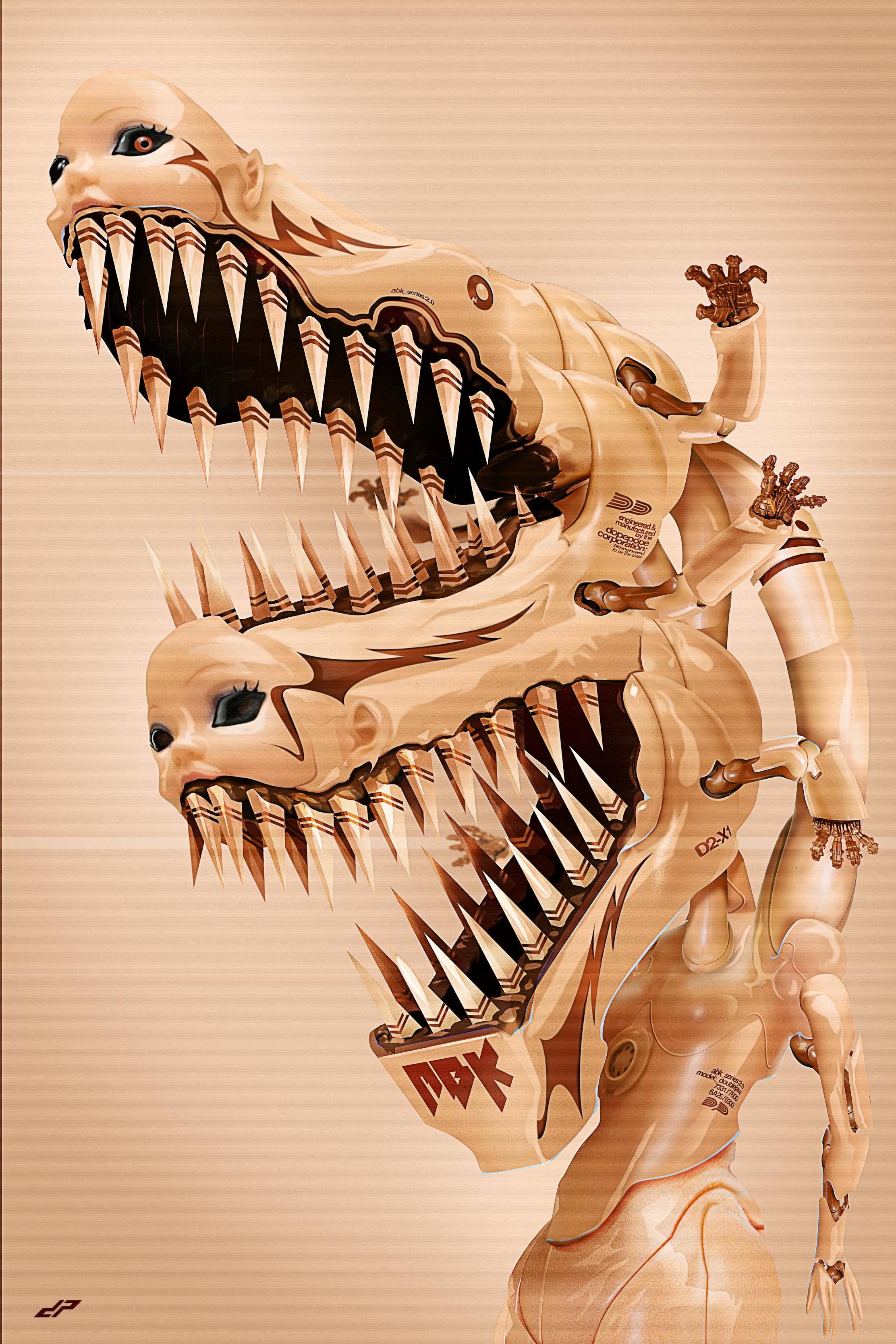 DoubleJAW was created to tear through flesh and crush bone, all while demoralizing those that bear witness. Another enormous advanced bio-mechanical mechanism designed by an anti-human AI to exterminate all people. Several variations were manufactured, all with aesthetics designed to paralyze with fear, then tear to shreds. The AI was an early experiment by the DopePope corporation that they admit "got away from them" but are now "just curious to see what it comes up with".