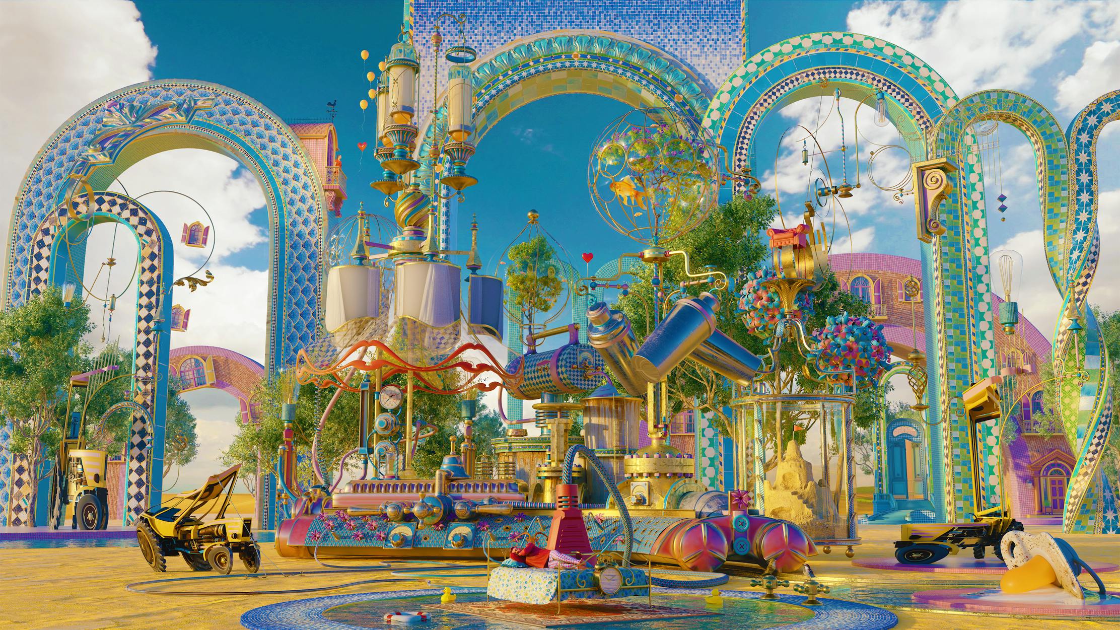 Using surrealism, Fatherhood depicts in an optimistic form, through colors and shapes, the moment that a man becomes a father, there is a turbulent world out there with chaos and lots of noise while he manages to get some peaceful sleep, a plug connected to the other side of the bed shows a whole complex system, is it on the mom's side? She is at the top and stares at this new horizon like a captain. "This is one of my most complex and meaningful artwork, this event is true to my present life and when I heard I was going to be a father I felt deeply inspired to bring the best of me to create something that could perhaps relate to other people.