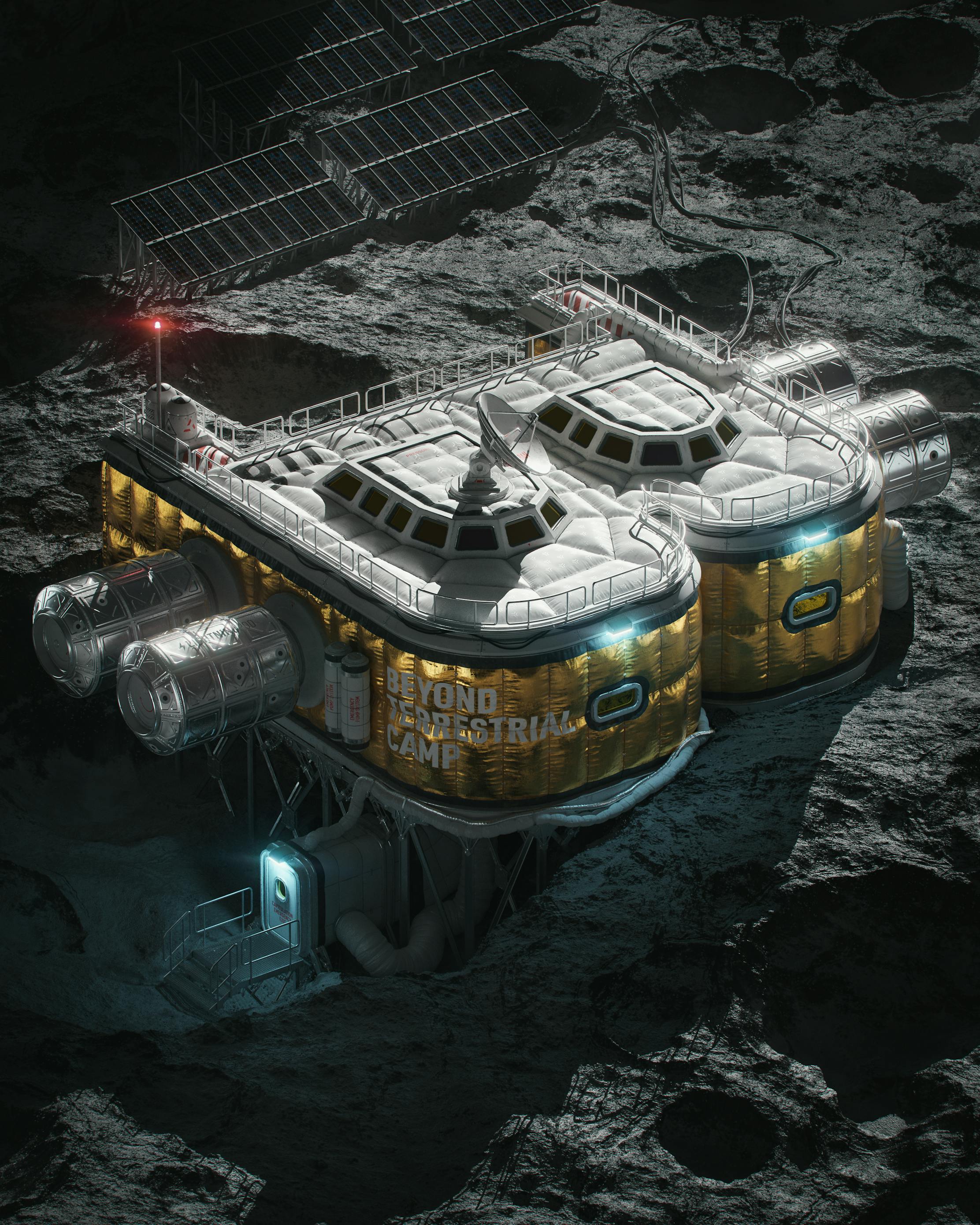 Beyond Terrestrial Camp-01 (also known as BTC-01) is the first human base on the Lunar surface. Conceived for the first time back in 2013 after the first wave of public interest. Its rocky history is riddled with delays caused by insufficient technology and a lack of public funding. It wasn't until 2021 when the base was successfully established. The padded design provides good insulation from misinformation and also softens even the deadliest of cat bounces. Gold-plated sides are protecting its instruments from SEC radiation and also work as Schiff Camouflage System (SCS). Its multi-band dish can receive bans from China across all frequencies. In 2018 the Lightning pods were added for more efficient movement of supplies.