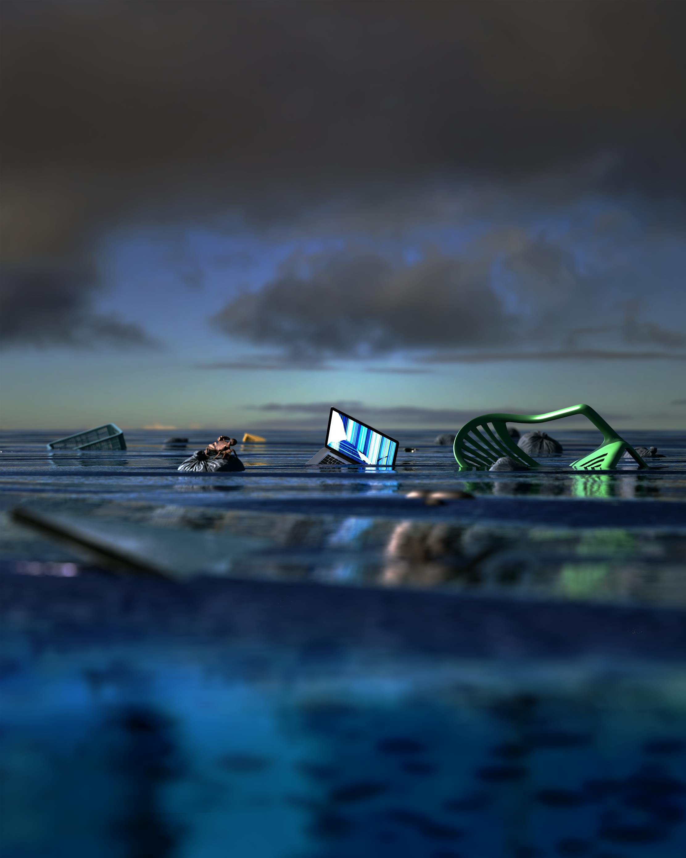 The 8k 3D illustration is a figurative visual representation of self-caused errors made by humanity which is affecting marine and sea life. The materialistic approach of humans increases the footprint on nature and causes its destruction to full fill the unwanted desires and comfort.