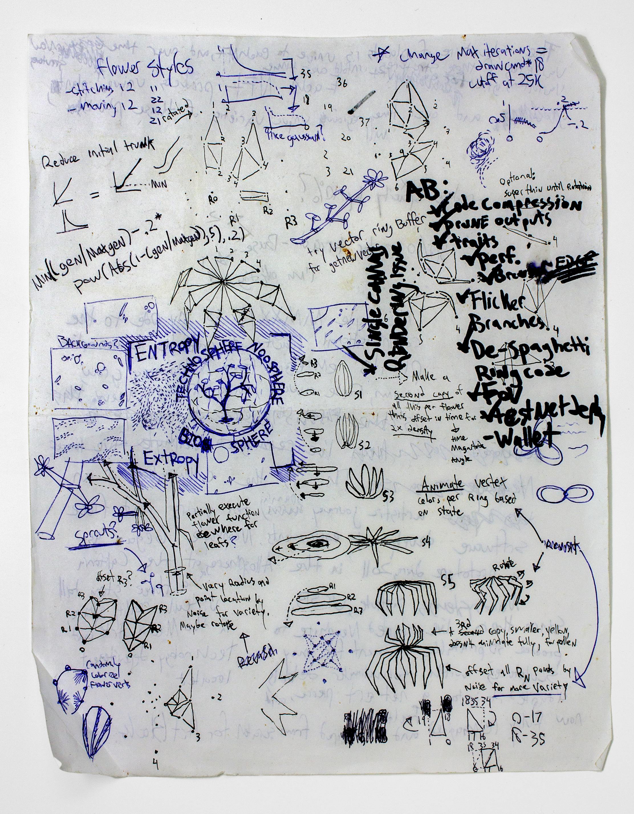 Neophyte MMXXII is my ode to the computational beauty of nature. This sheet of paper served as my development notes from August 2021 to Feb 2022.