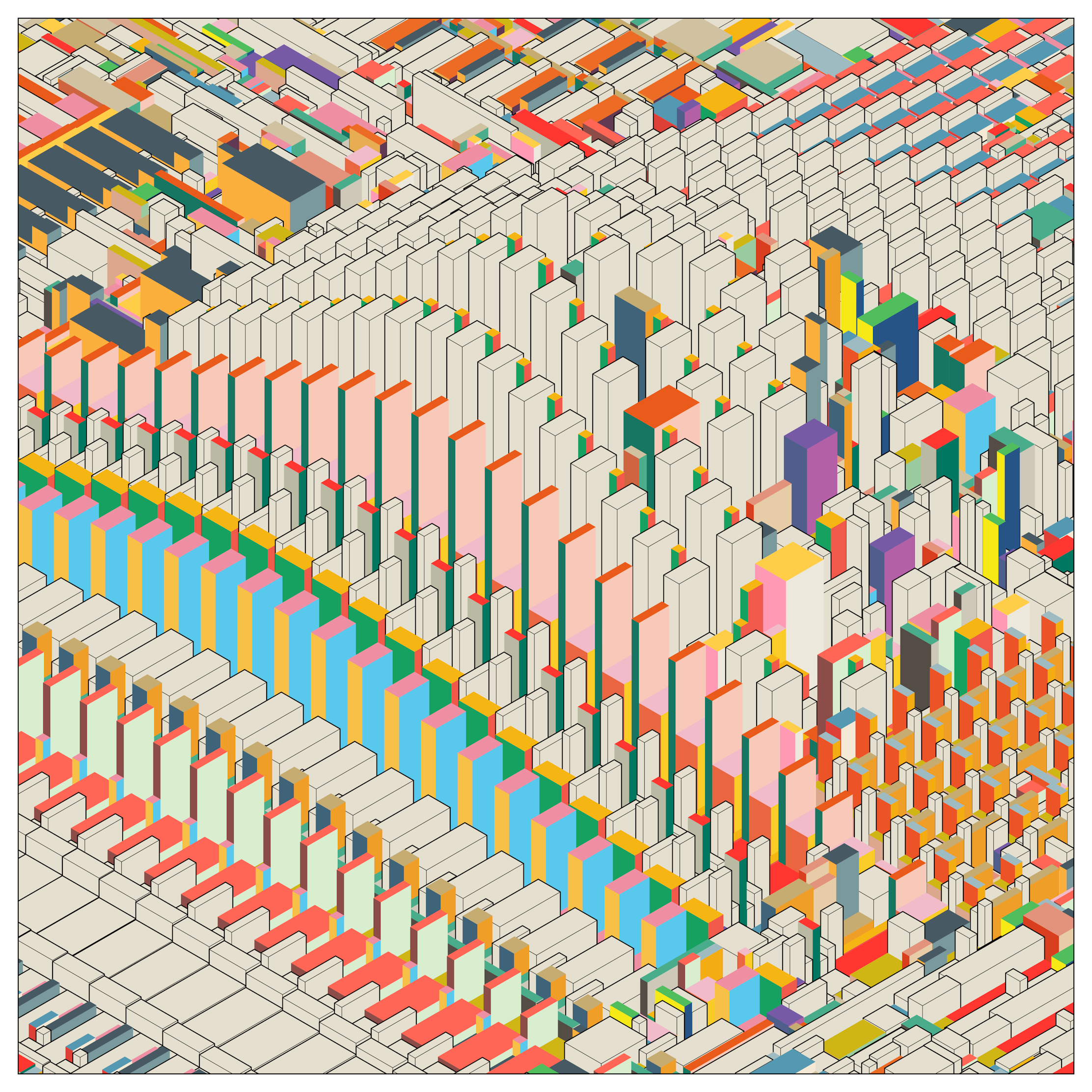 When is something perceived as an orderly system and at what point are we giving up, treating it like chaos? The Iteration series attempts to give nuance to the juxtaposition of structure and disarray. It creates an impression of structure by generating a random layout of blocks and repeating it in two directions. By making the process of repetition imperfect, with a small chance of mutating the initial layout, a feeling of chaos is reintroduced.