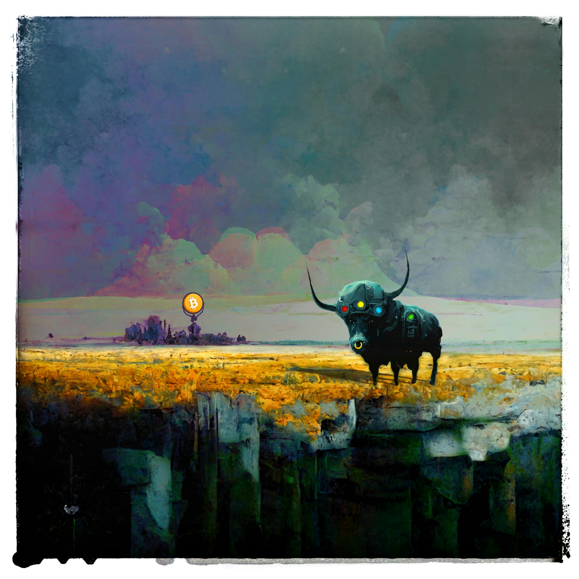 Work born from three A.I. (text to image) generated pieces which, through the "crypto" symbology, represents the concept of waiting. Post-production on each piece, collage, digital drawing and painting and final composition post-production.