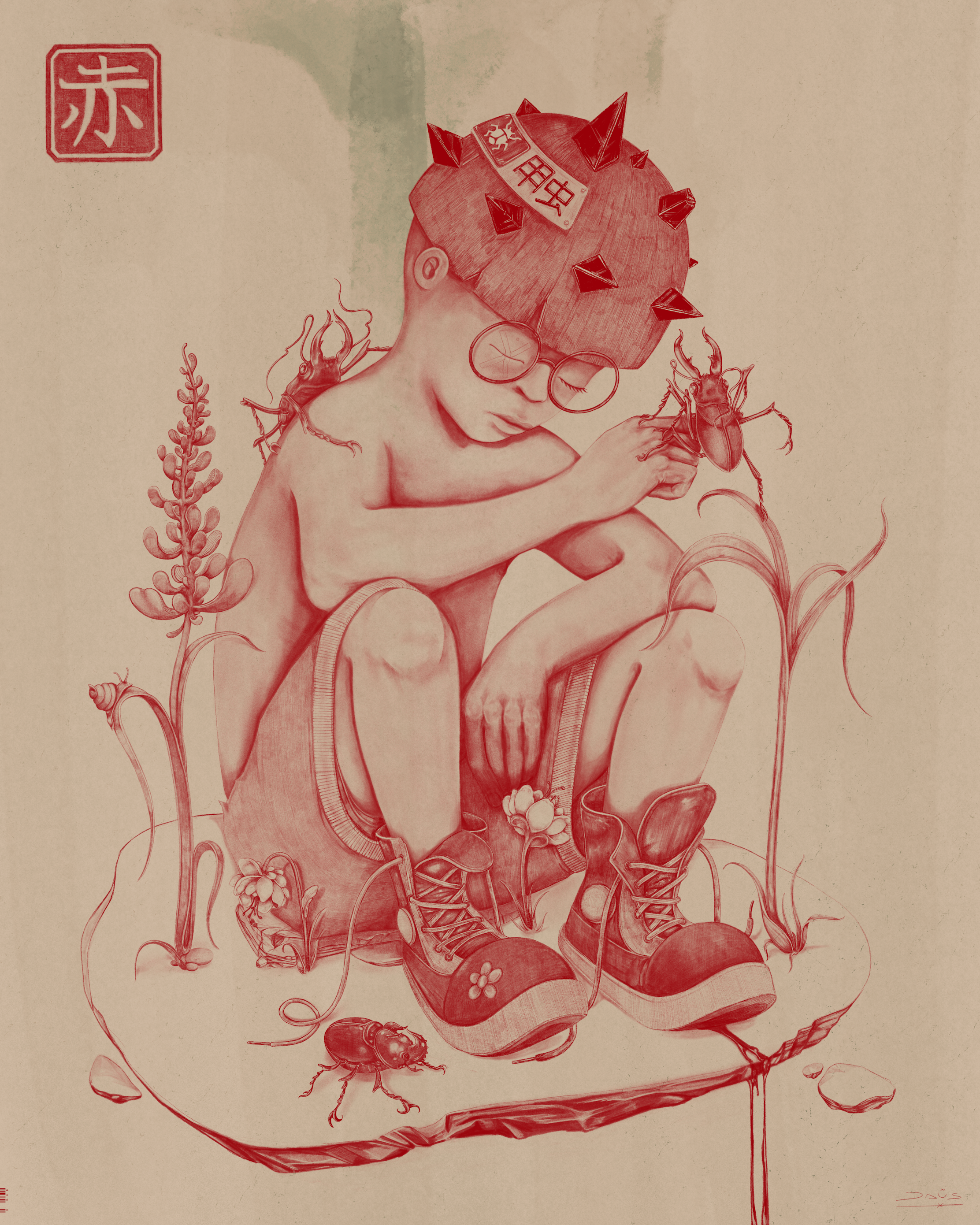 "RED BEETLE" started as a self-imposed challenge to only use one color and one brush to create a whole piece.
