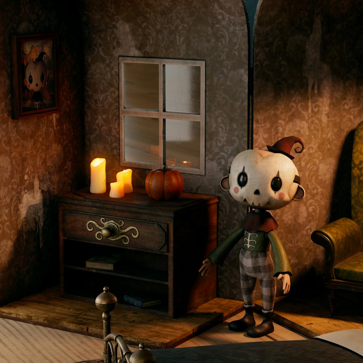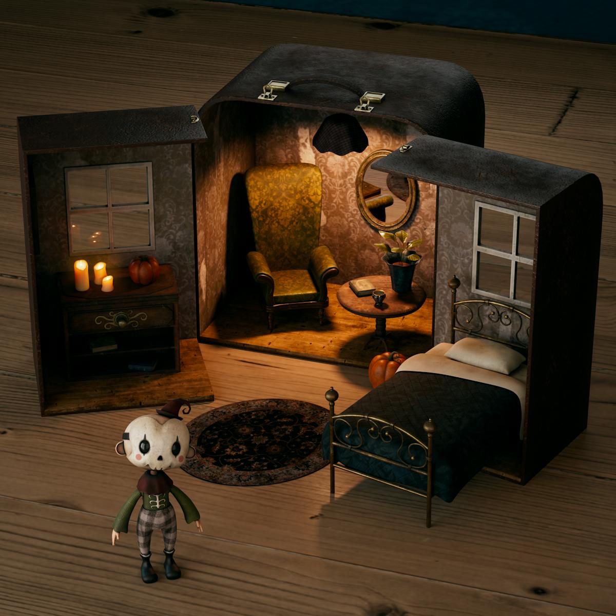 Skully Boo is a little plaster toy who likes to enjoy the comfort of his custom-made leather suitcase residence.
