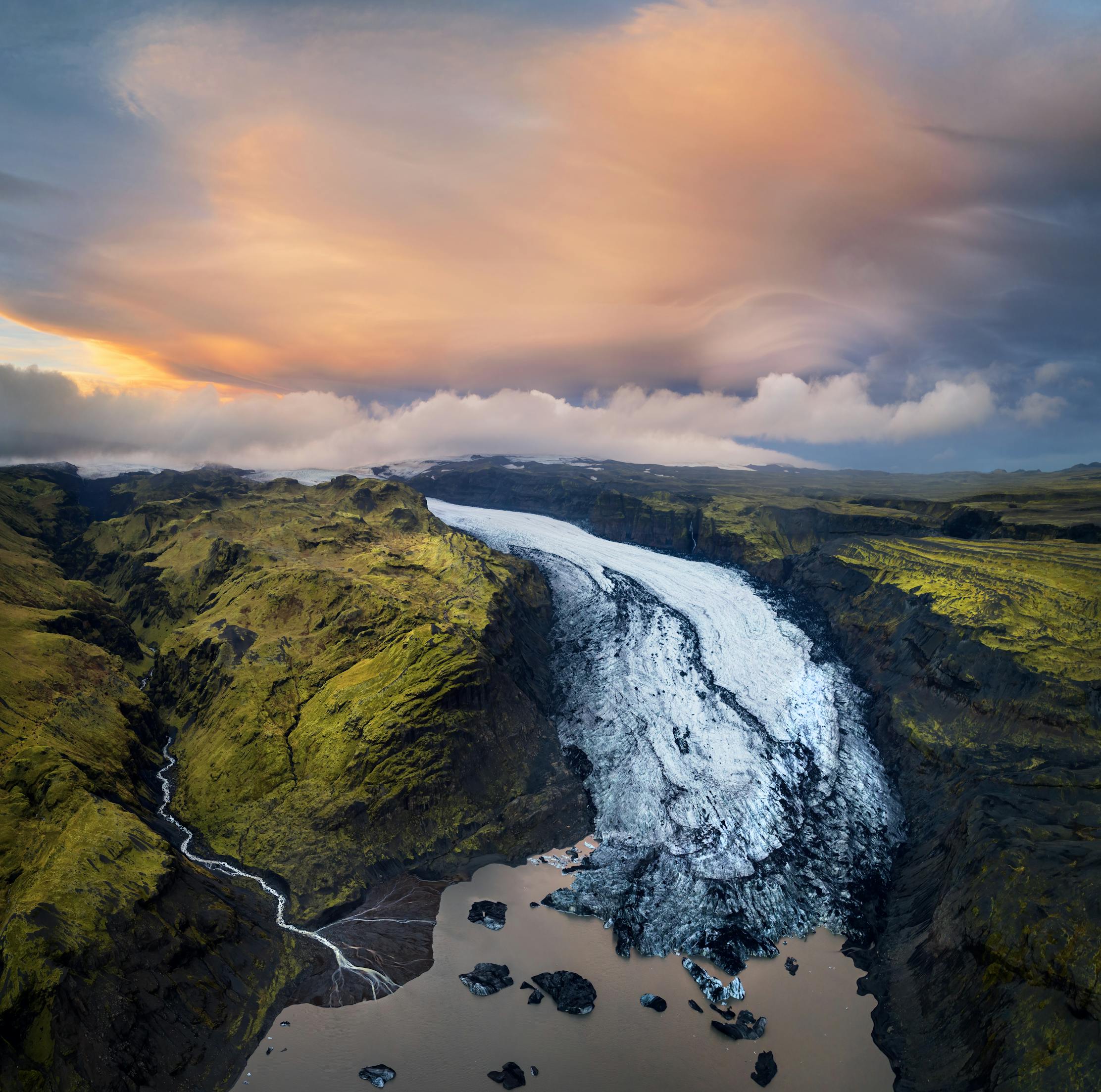 The image you see here is a panorama stitched together from two photos. Within a valley full of lush vegetation, a towering wall of ice stands firm. Complementing its unwavering presence, a slender stream meanders through the valley, gracefully navigating until it merges with other waters. This juxtaposition embodies the interplay of strength and adaptability, of form and flexibility. Yet, the true showstopper is the sky itself. As dusk descends, the Icelandic sky ignites with brilliant shades of red and orange. The clouds serve as natural diffusers, intensifying the overall spectacle. The interplay of depth and drama, texture and tone, results in a visually stunning scene that demands more than a passing glance.