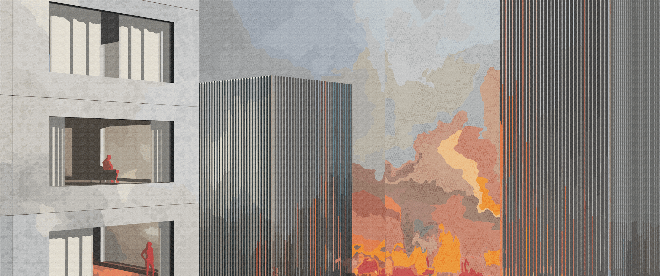 " The Bear Market” is a piece that captures our feelings in the current market turmoil; a fire amidst a forest of buildings depicts our fears, doubts, and endless greed. Despite this, it expects new beginnings to rise, showing our strength to change and thrive again together.