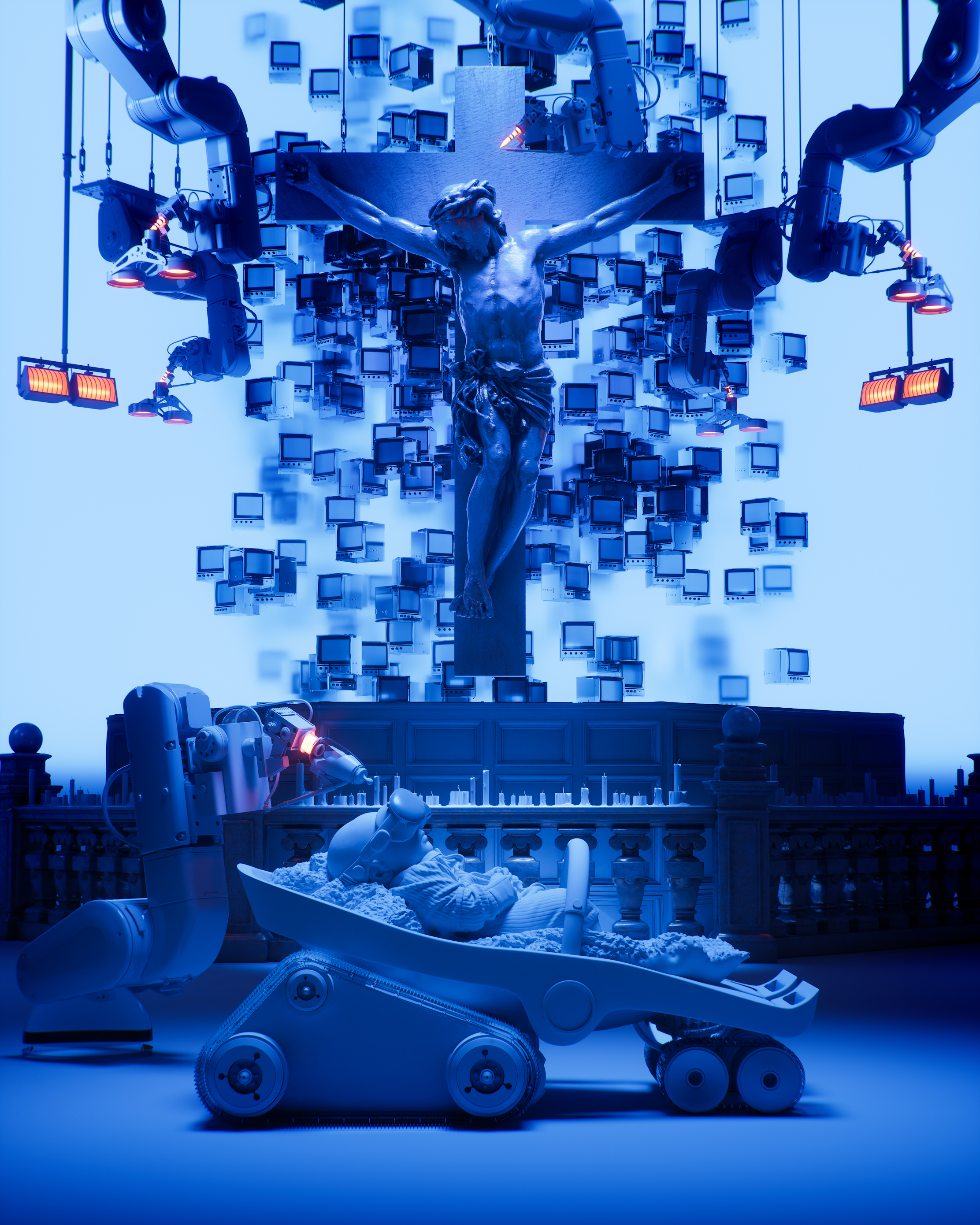 The row of closed televisions behind Jesus reflects the emptiness of individuals and the loss of inner depth in the modern world. The televisions represent individuals bombarded with content while symbolizing the distraction and wastefulness of attention and spirit. This image offers a strong critique of how technology and media manipulate the thoughts of a controlled society.