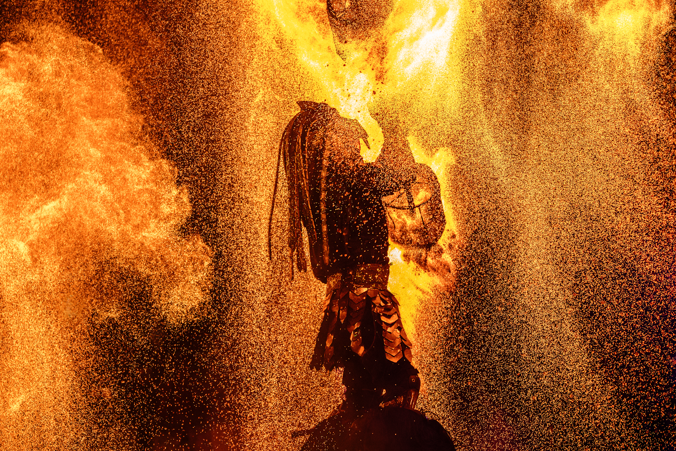 His form, wreathed in fire yet untouched, moved with the rhythm of cosmos. Each step ignited the earth, each gesture a spell weaving through the veil of worlds. With eyes like burning embers, he summoned spirits of old, their chants mingling with the crackling blaze.