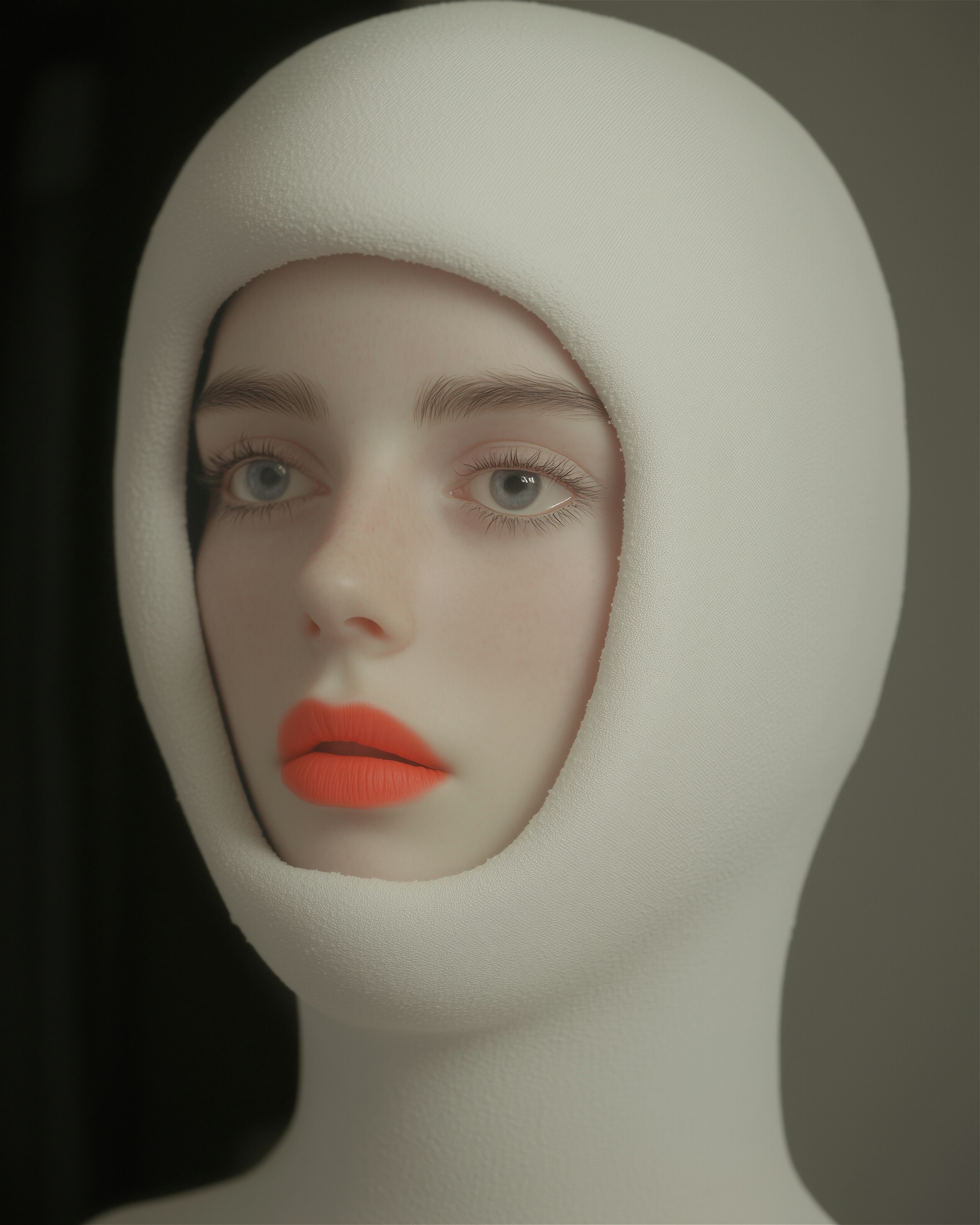 A face emerges from a world of silence, framed by purity and precision. The gaze, hauntingly serene, holds a quiet power—inviting you into its still, enigmatic universe.