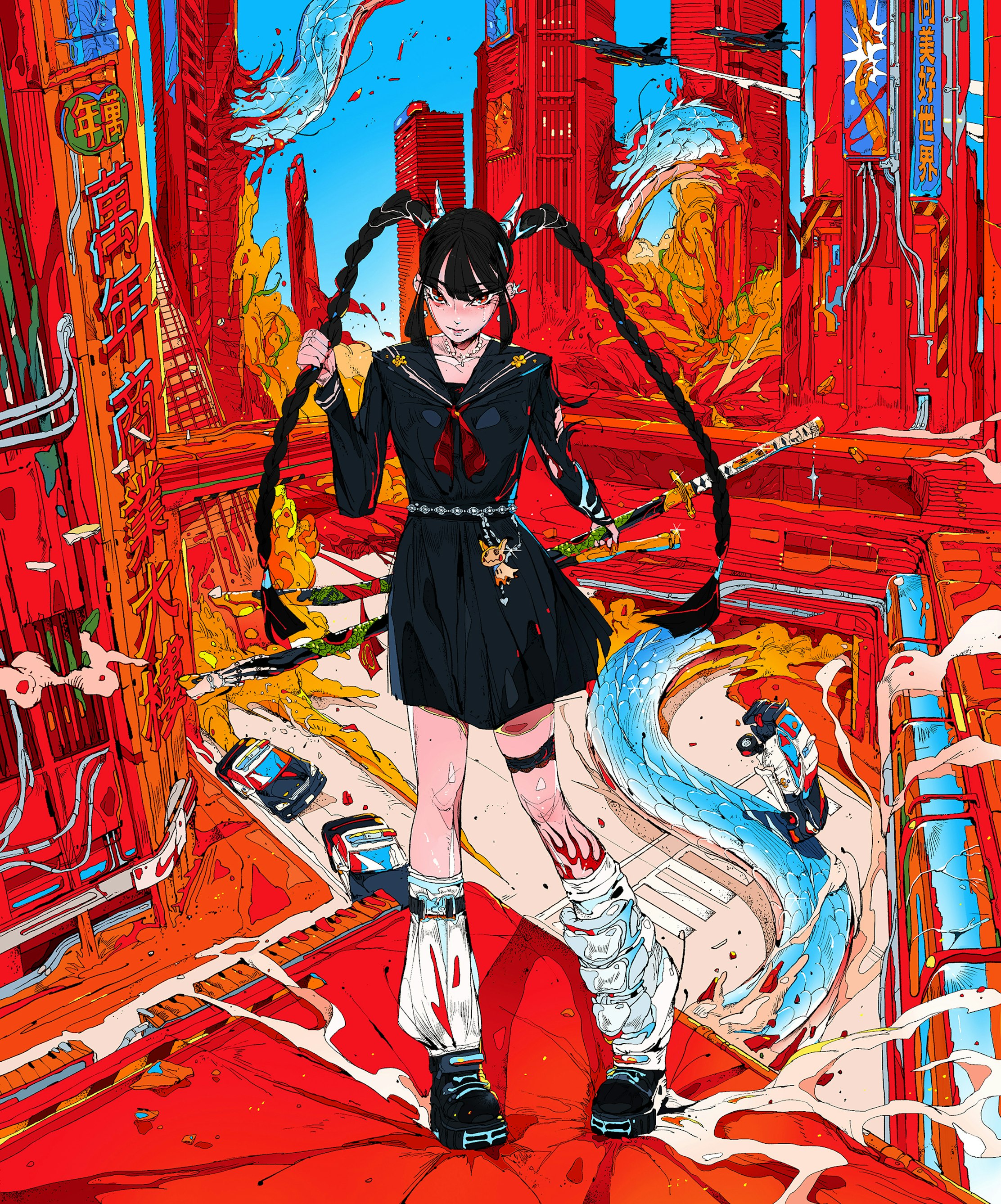 Crimson spreads like wildfire, devouring streets and towers, searing suppressed dreams.