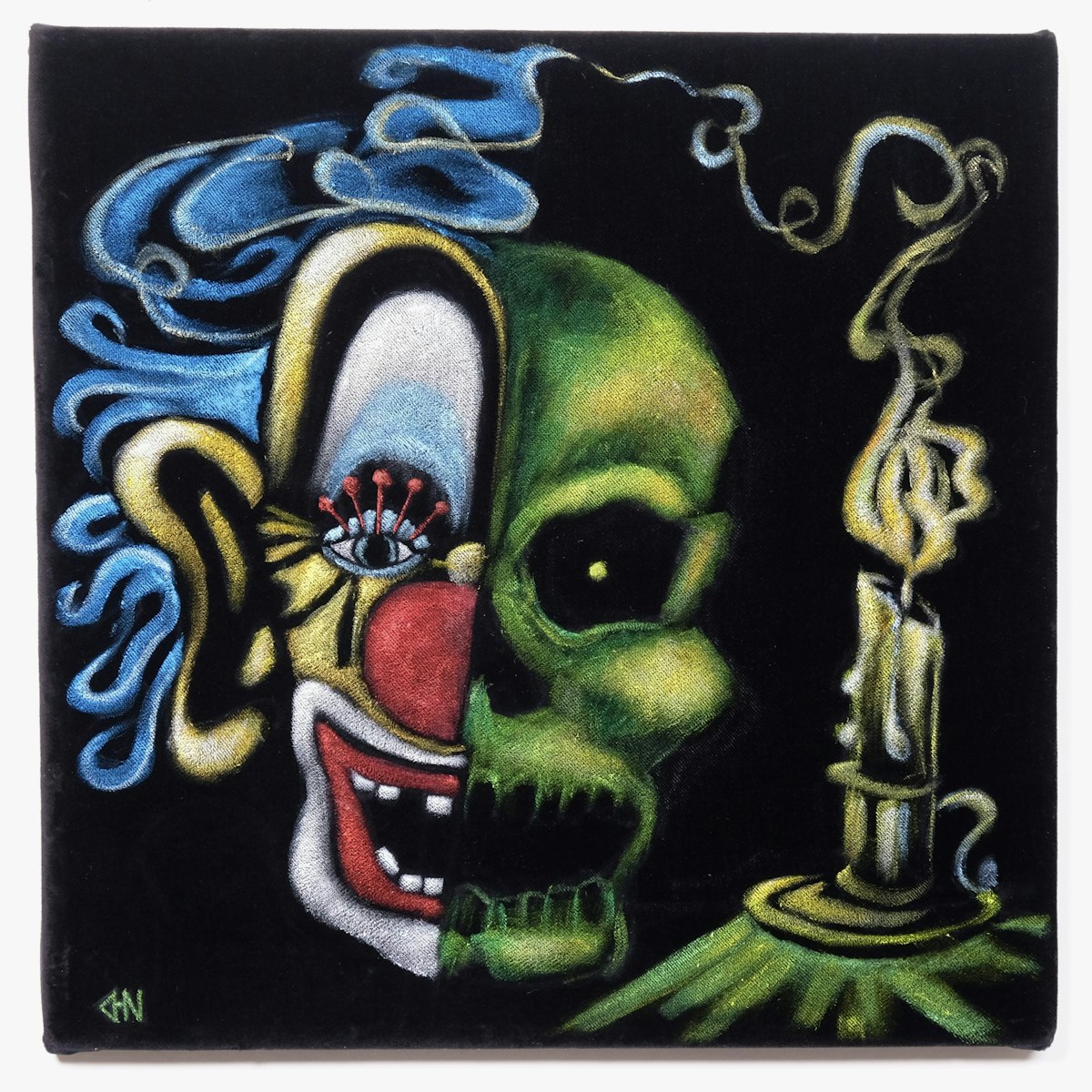Despite all his rage, he is still just a Mime in a cage. A look into the other-wordly character of the sad Mime, which is essentially the silent but outspoken Id. The walls he mimes are real. The image of the cage is influenced by Francis Bacon, for its existential crushing force. This is the fourth black velvet painting of 2025. It measures 19"x19" inches and was painted with acrylic on velvet. Made in Brooklyn, NY and competed on October 27th 2025. the piece is signed on the front and signed and dated on the back. The physical painting is included with the token.
