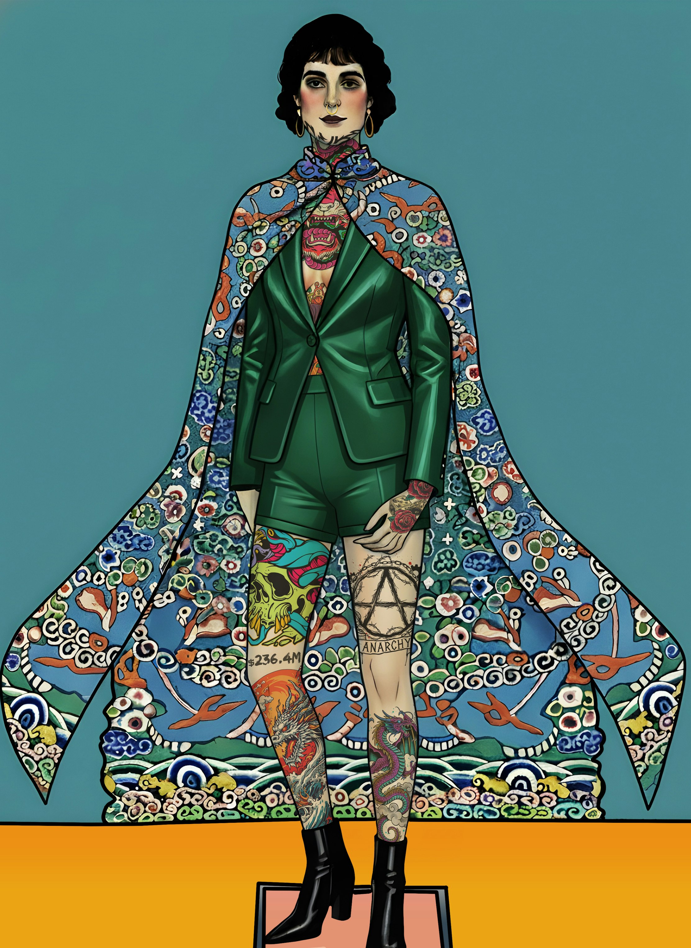 Elisabeth, Unbound” is a reinterpretation of a figure once confined to the aesthetics of another era. Here, she steps forward unrestrained, reborn in modern fabric, modern ink, and a modern voice. The classical composure remains, but her identity has shifted into something self-defined, shaped by the symbols she chooses to wear and the stories etched into her skin.