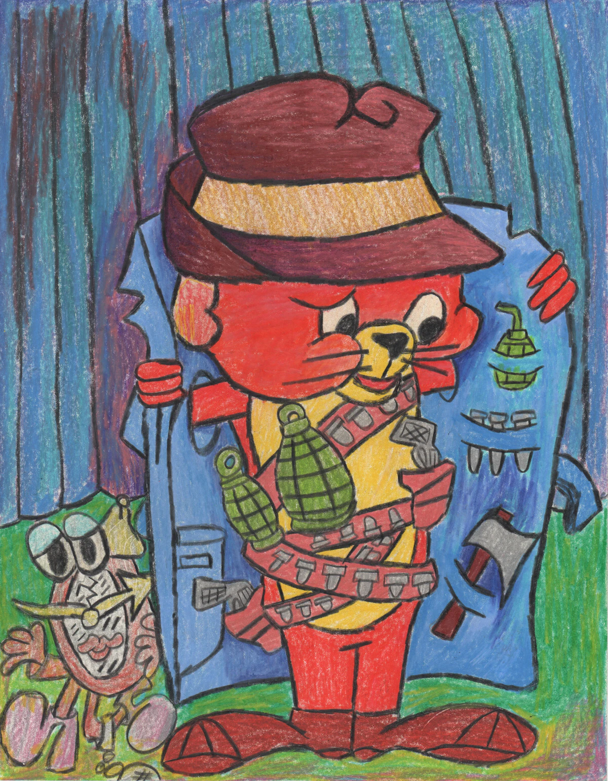 No one’s quite sure what he’s carrying—odd gadgets, questionable trinkets, half-baked schemes—but he’s definitely got something for everyone. He moves like he knows more than he lets on, eyes darting, collar popped, living in the shadows between curiosity and trouble. Part peddler, part prankster, all mystery.