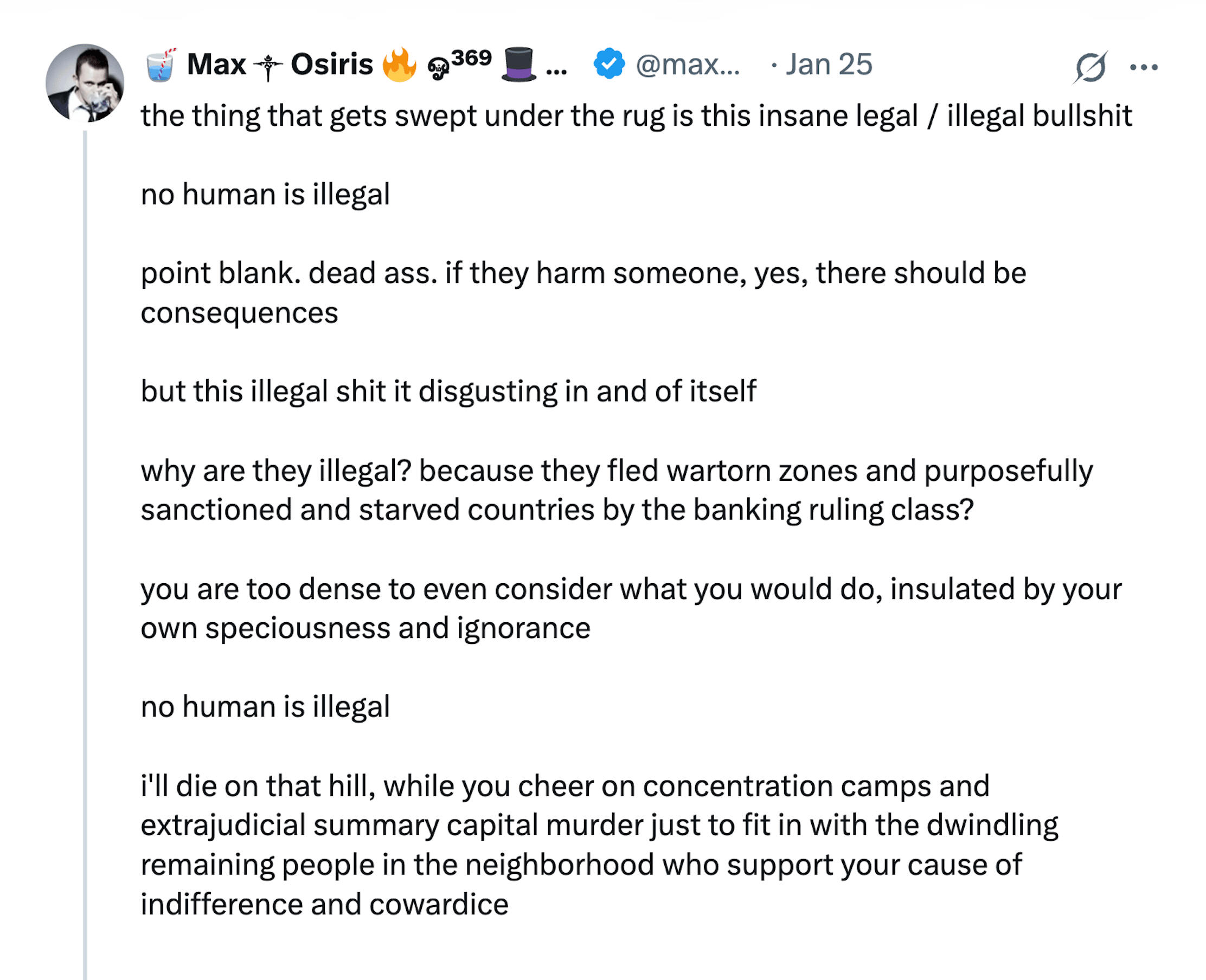 i'll die on that hill, while you cheer on concentration camps and extrajudicial summary capital murder just to fit in with the dwindling remaining people in the neighborhood who support your cause of indifference and cowardice